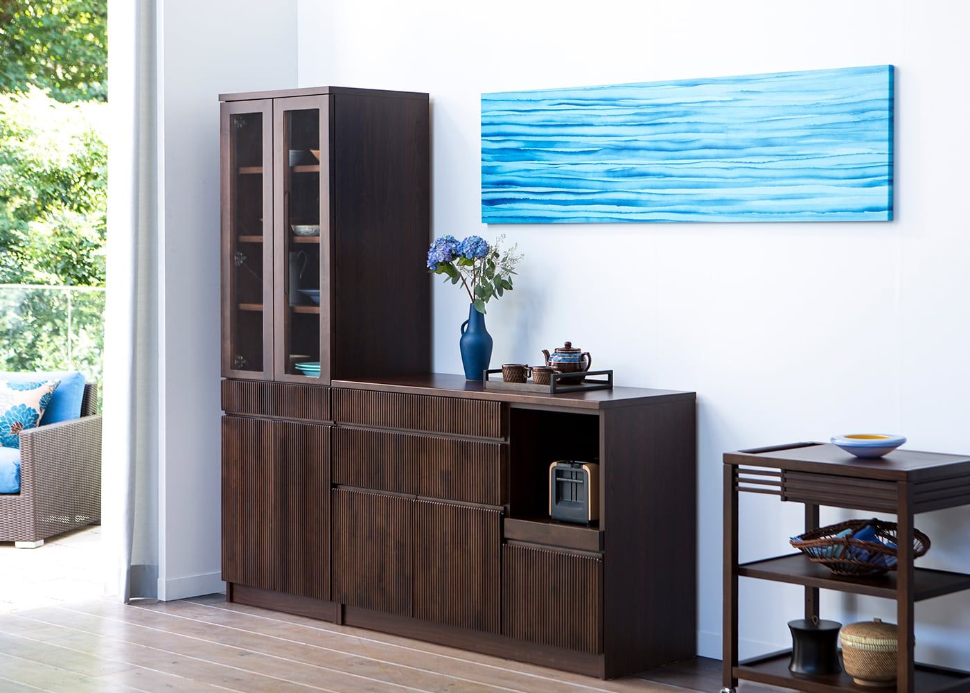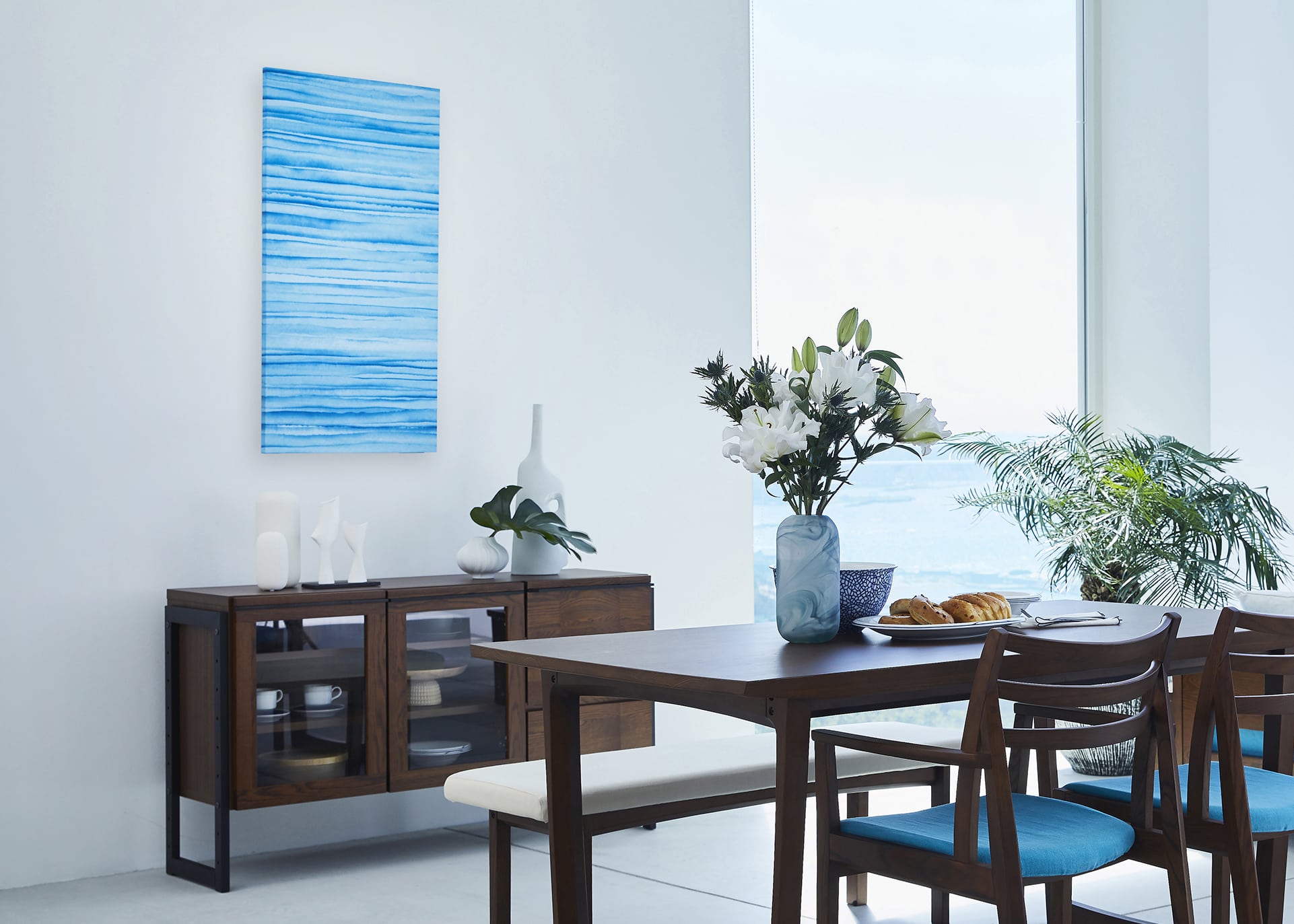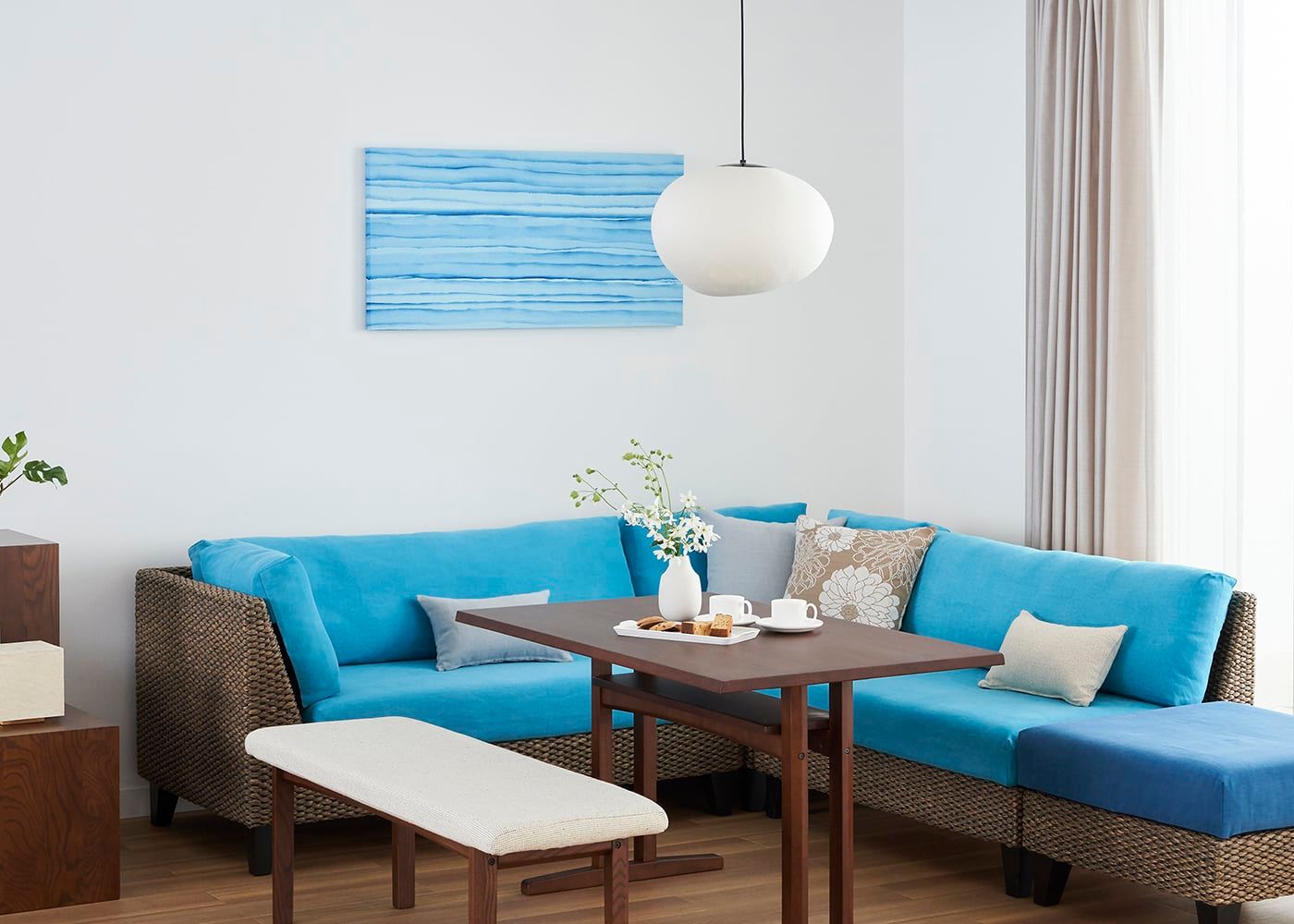 ソファダイニングに海と空を連想させるカラーをプラスしたコーディネート例。爽やかな色合いでまとめた