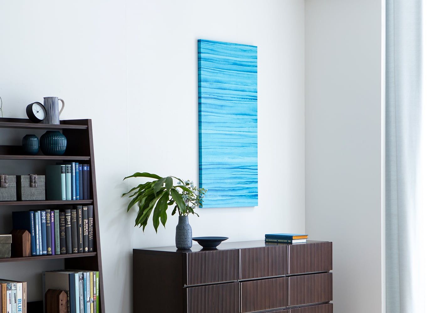 600×430タイプは、壁面のスペースを選ばないコンパクトサイズ。飾るだけで簡単にシーサイドブルースタイルを取り入れられます。単品使いはもちろん、ソファやベッド上の壁面に2枚並べると、シンメトリーで整然とした雰囲気を演出。壁に穴が開けられない方は、キャビネットの上に置いて飾るのもおすすめです。(写真は600×430タイプ)