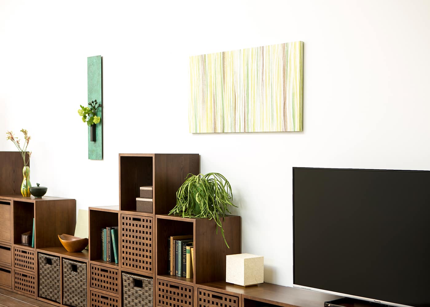 600×430タイプは、壁面のスペースを選ばないコンパクトサイズ。飾るだけで簡単にガーデングリーンスタイルを取り入れられます。単品使いはもちろん、ソファやベッド上の壁面に2枚並べると、シンメトリーで整然とした雰囲気を演出。壁に穴が開けられない方は、キャビネットの上に置いて飾るのもおすすめです。(写真は600×430タイプ)