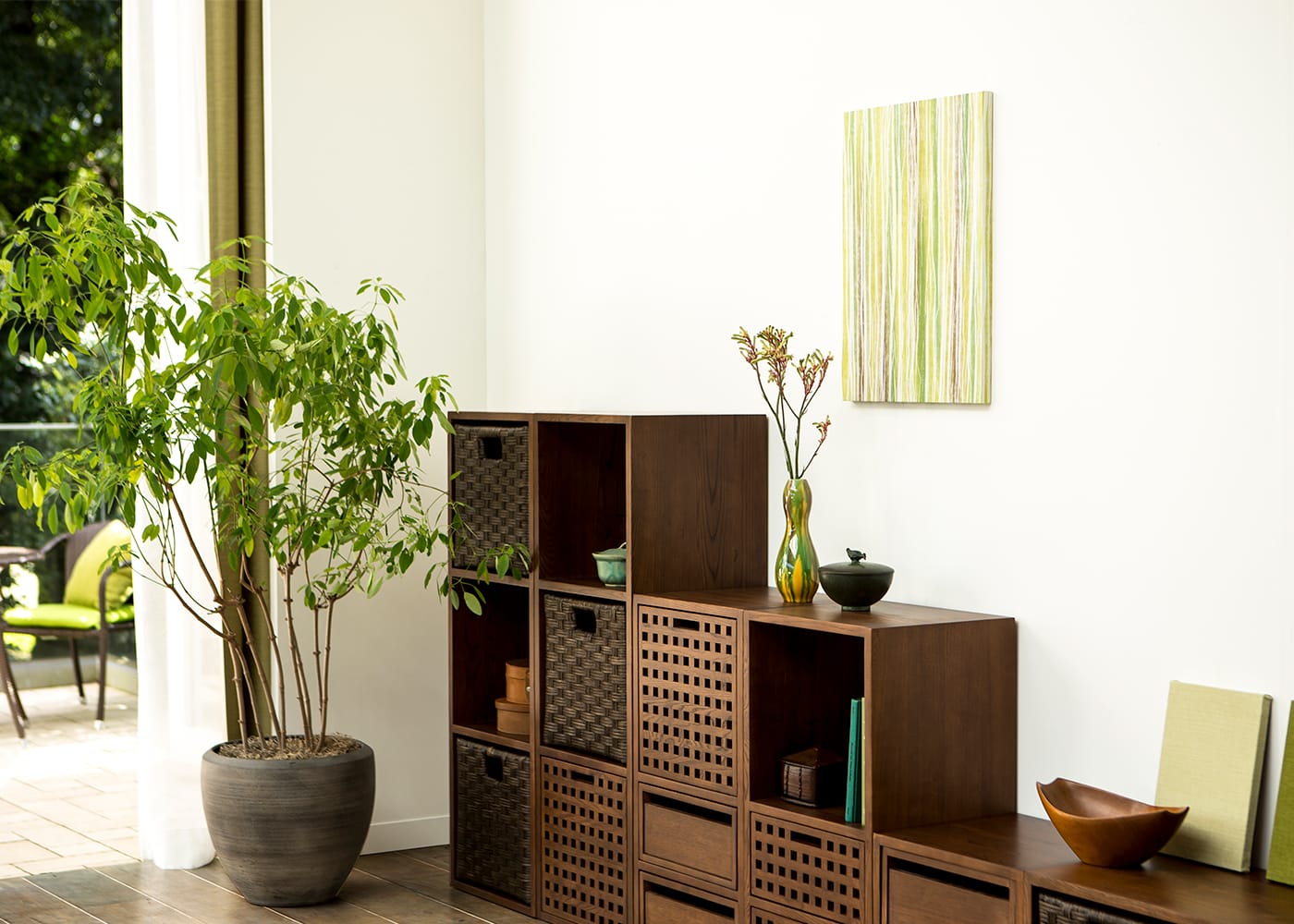1000×500タイプは、ソファや収納、ベッド上の壁面などに飾り易いちょうど良いサイズ感で、1枚飾るだけで木々がもたらす癒しの空間に。幅の広いローボードの上にそのまま置いて飾るのもおすすめです。(写真は1000×500タイプ)
