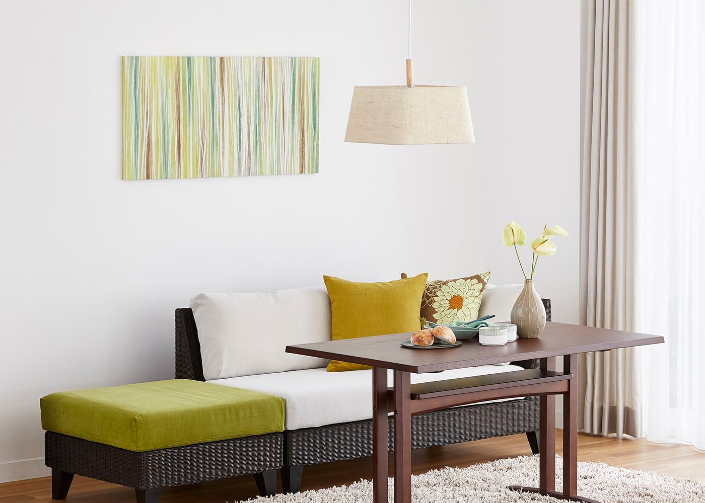 ソファダイニングを優しいグリーンで彩ったコーディネート例。おしゃれな