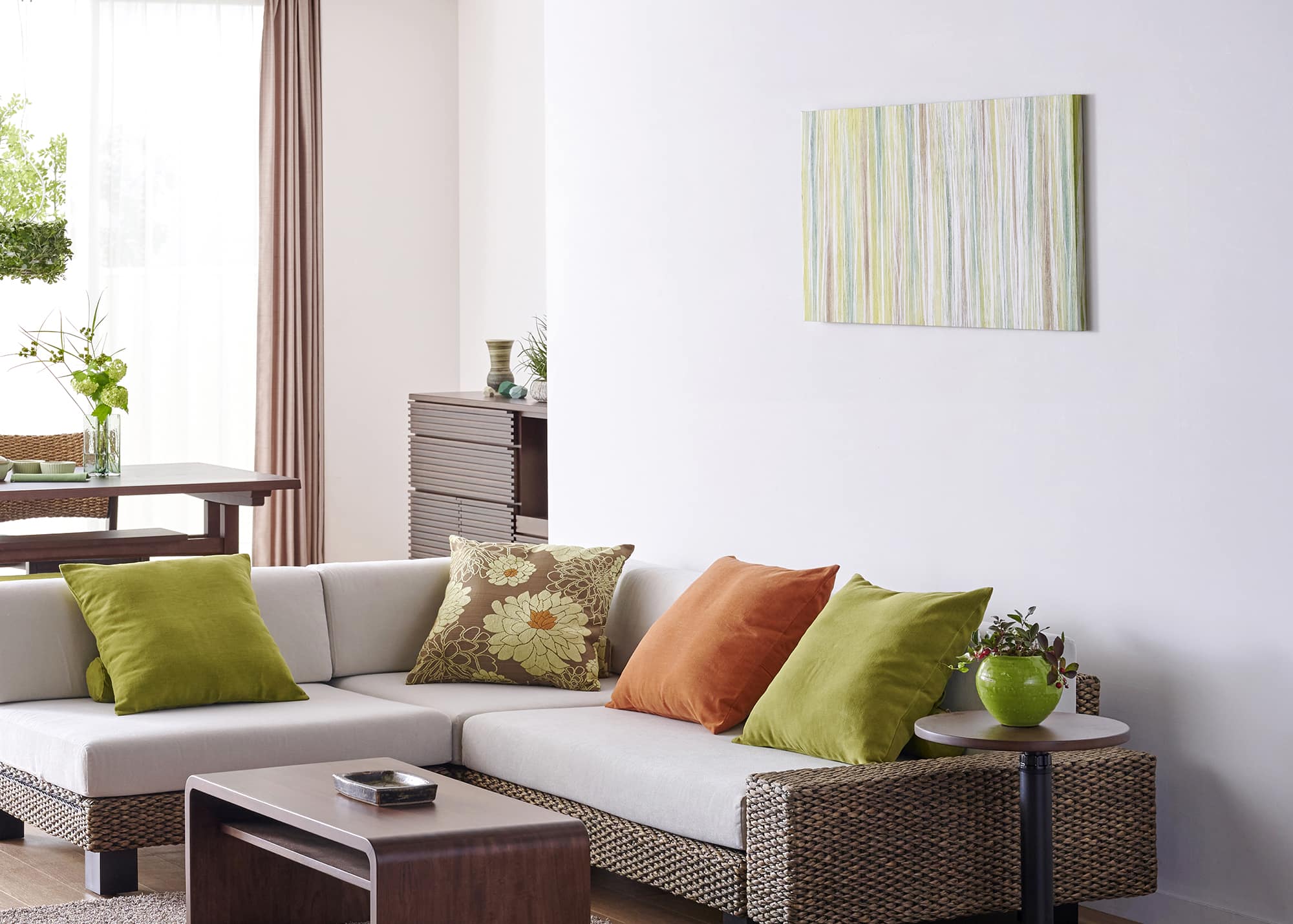 鮮やかなグリーンとオレンジをテーマカラーにしたリビングのコーディネート例。アジアンリゾートのようなコントラストが付いた