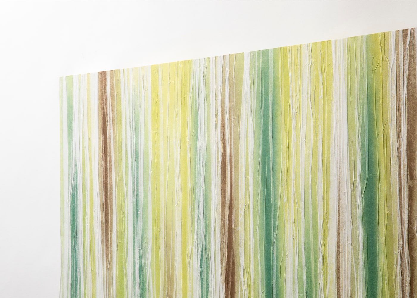 平安時代から伝わる歴史と実績によって、国の伝統工芸品に選出されている高知県産の「土佐和紙」。越前や美濃と並ぶ日本三大和紙の1つです。その土佐和紙の中でも、美術品や文化財の修復に使用され、国の重要無形文化財である「土佐典具帖紙(とさてんぐじょうし)」を使用。「かげろうの羽」に喩えられるほどの厚み0.03mmという世界一の薄さを誇ります。そんな繊細な和紙を職人がプリーツ状に折り重ね、木々が見せるやさしい色で染め上げることで、そよ風で葉が揺らめく情景を描きました。