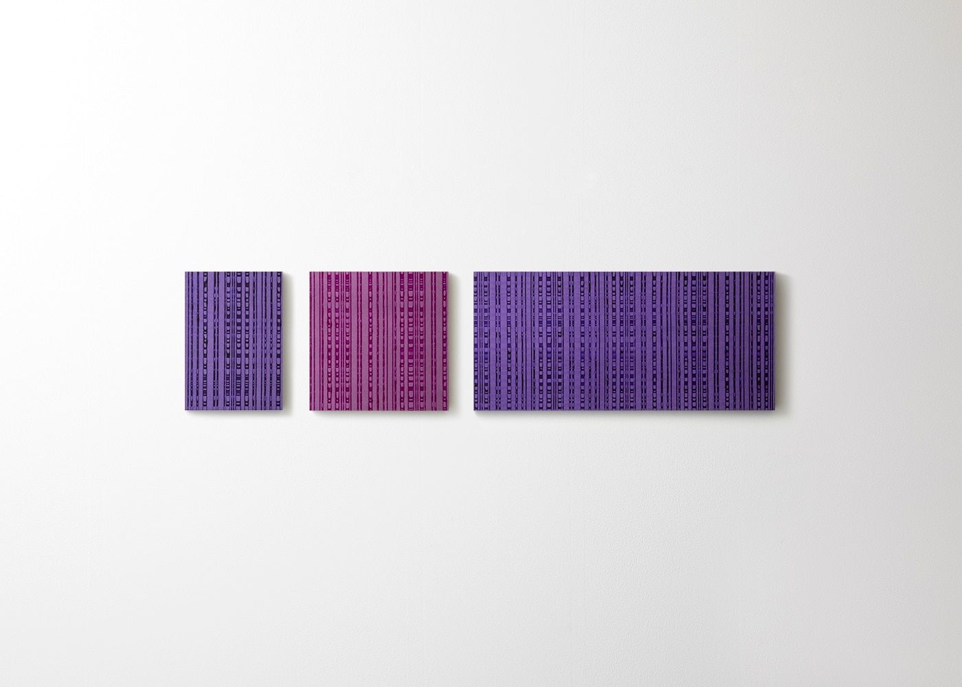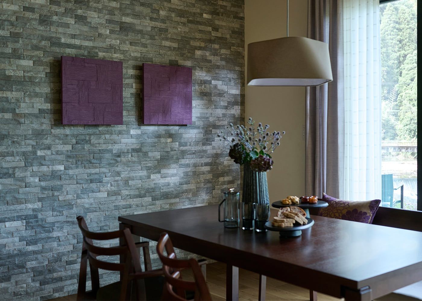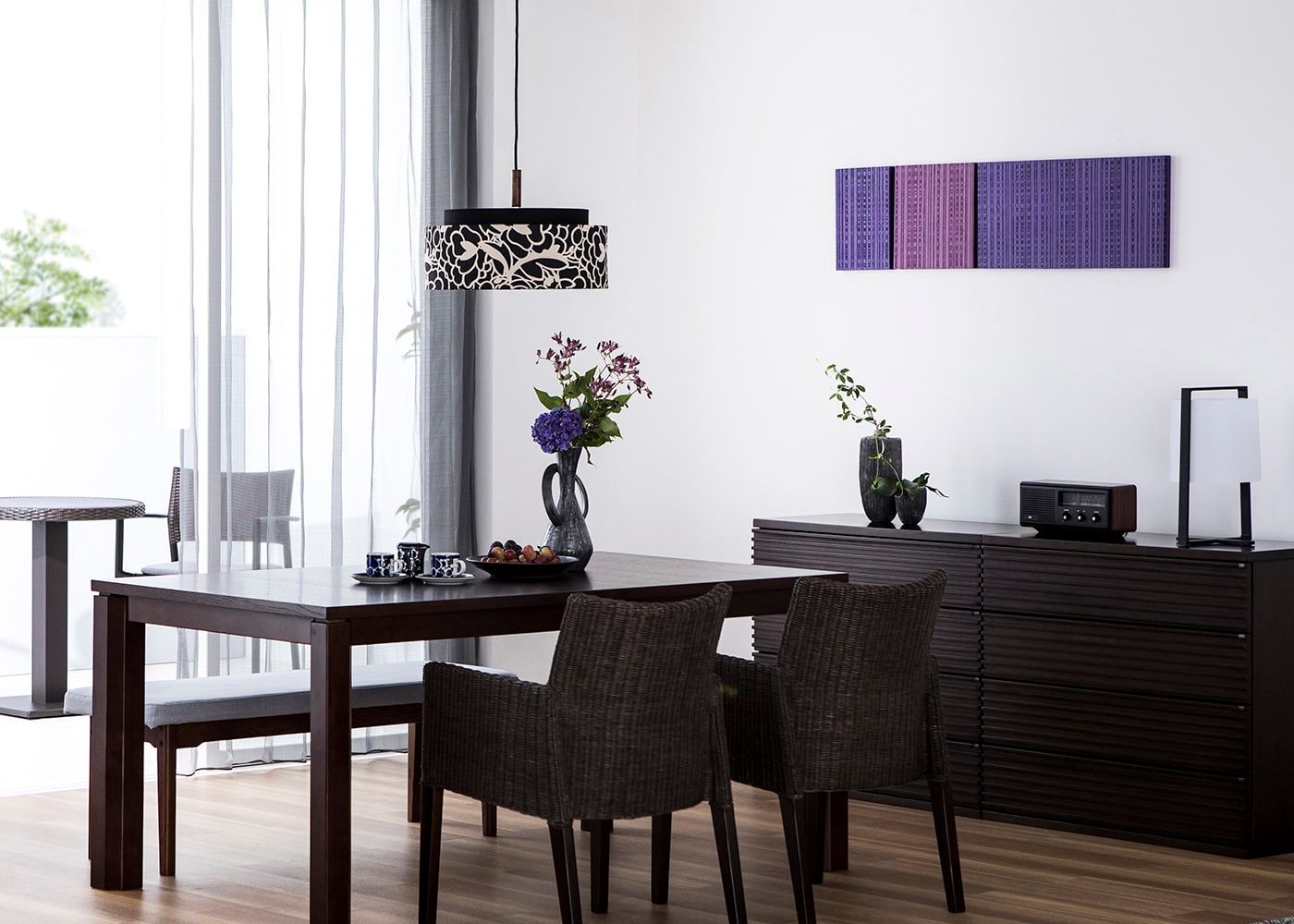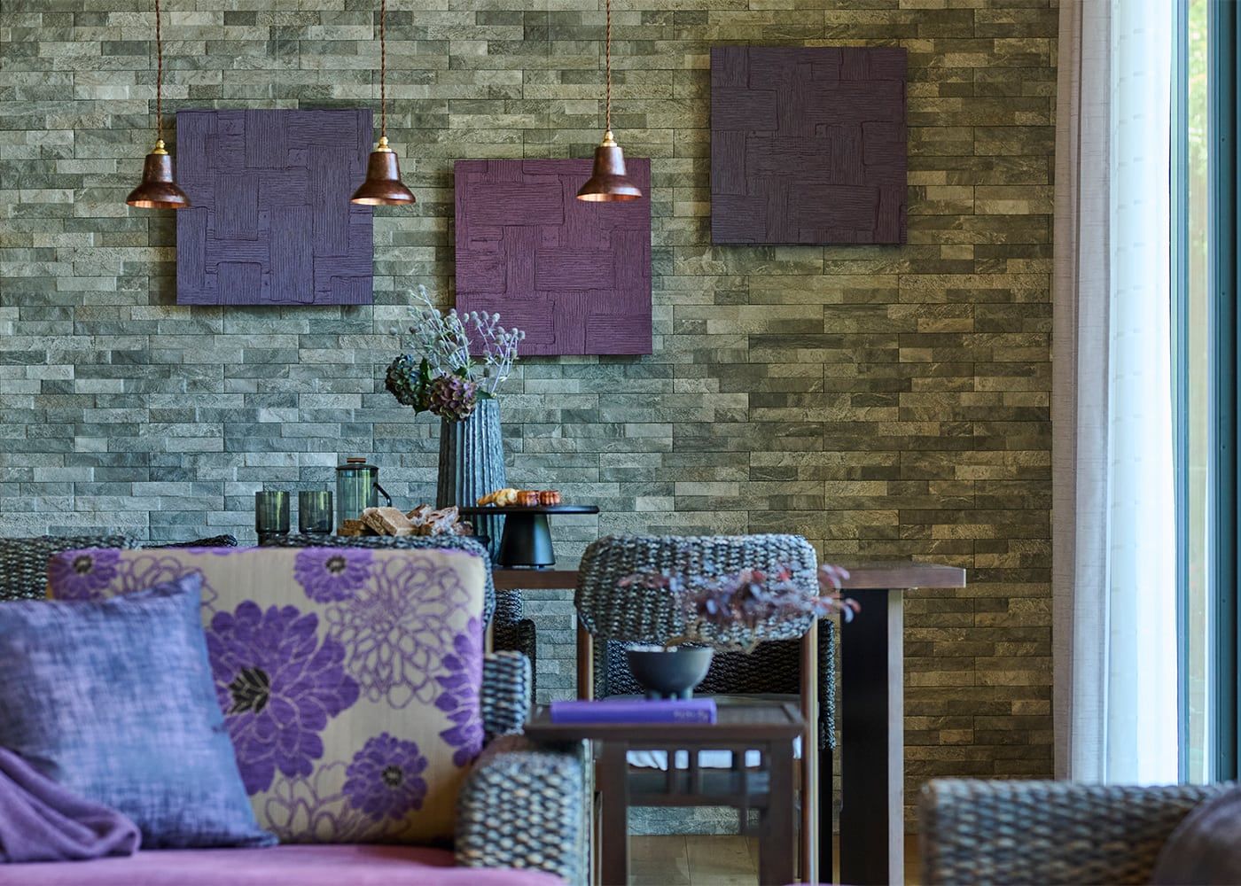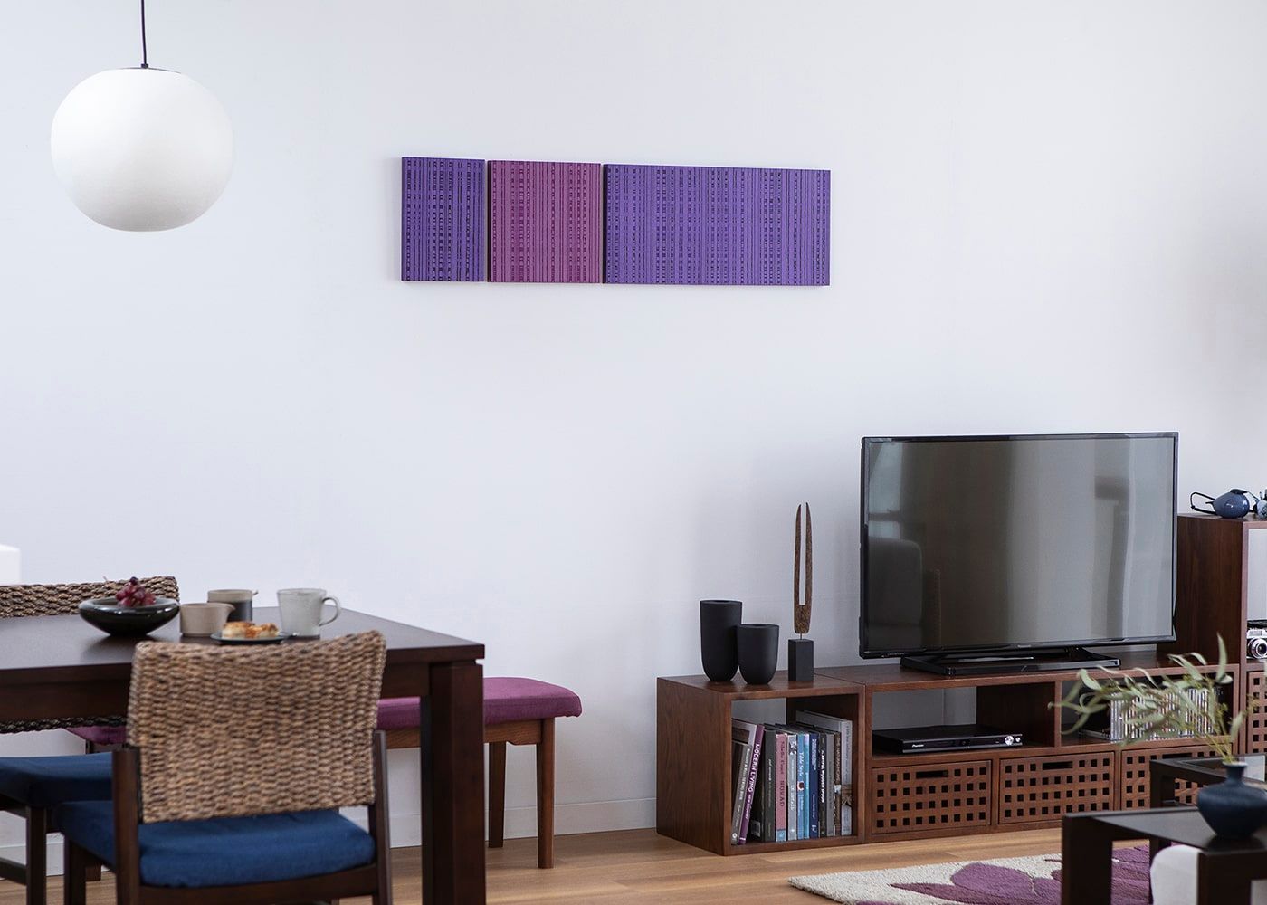 リビングとダイニングの間の壁面に飾ることで、パープルならではの上品で艶やかな雰囲気を演出。サイズと色の変化で自然のゆらぎが生まれ、見る人の心を魅了します。(写真は3タイプの組み合わせ)