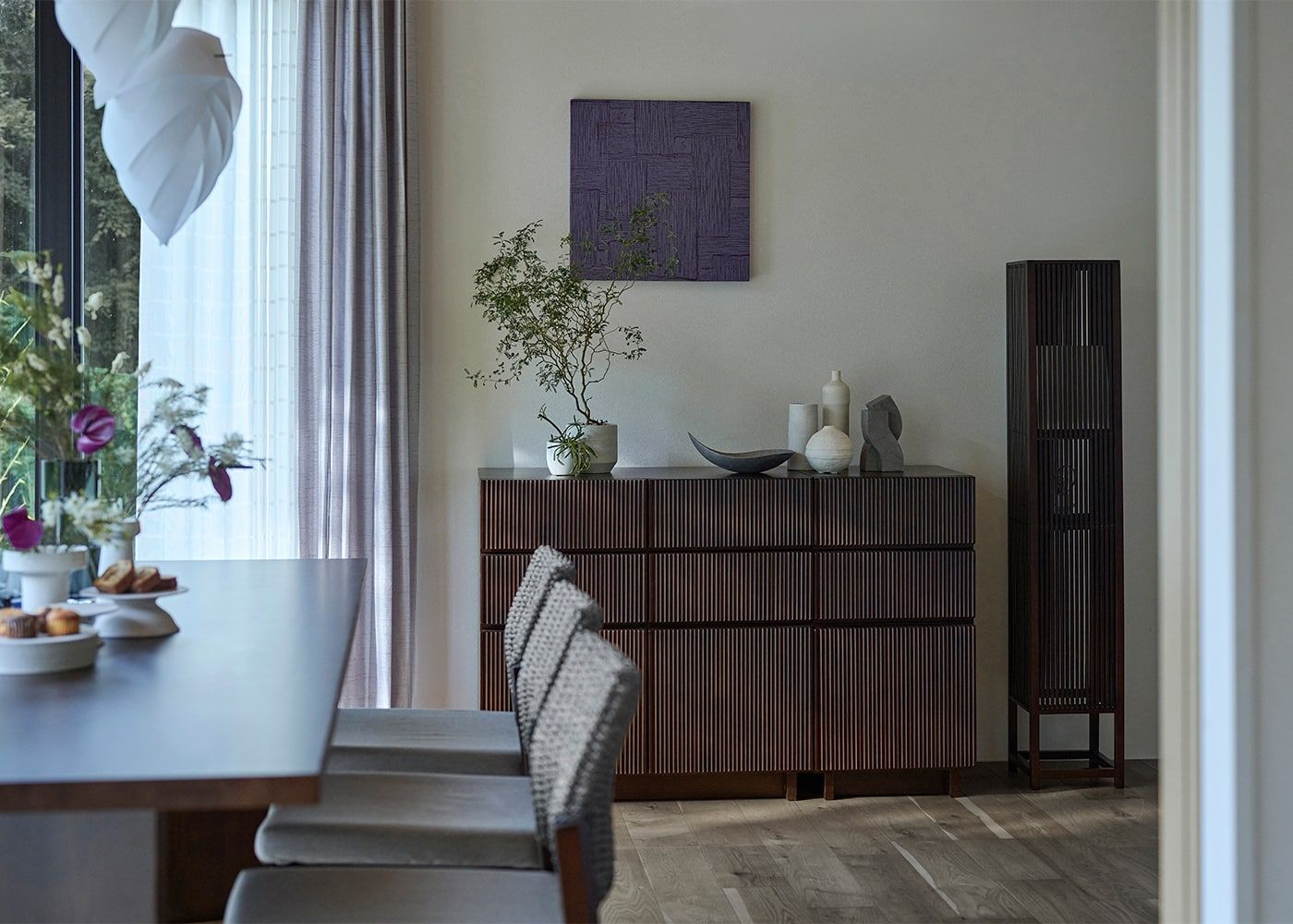 余白のあるリビングダイニングに正方形のアートパネルを飾ることで、まとまりのある空間に。櫛引模様と家具の線が調和し、洗練された雰囲気を生活の中で感じることができます。