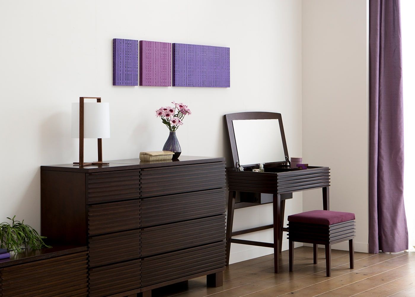 キャビネット上の花やドレッサーのスツールカバーのパープルとリンクした統一感のあるカラーコーディネート。横に流れる格子もルーバーデザインと見事に調和しています。(写真は上から210×300タイプと300×300タイプ)≫フラワーパープルコーディネートはこちら