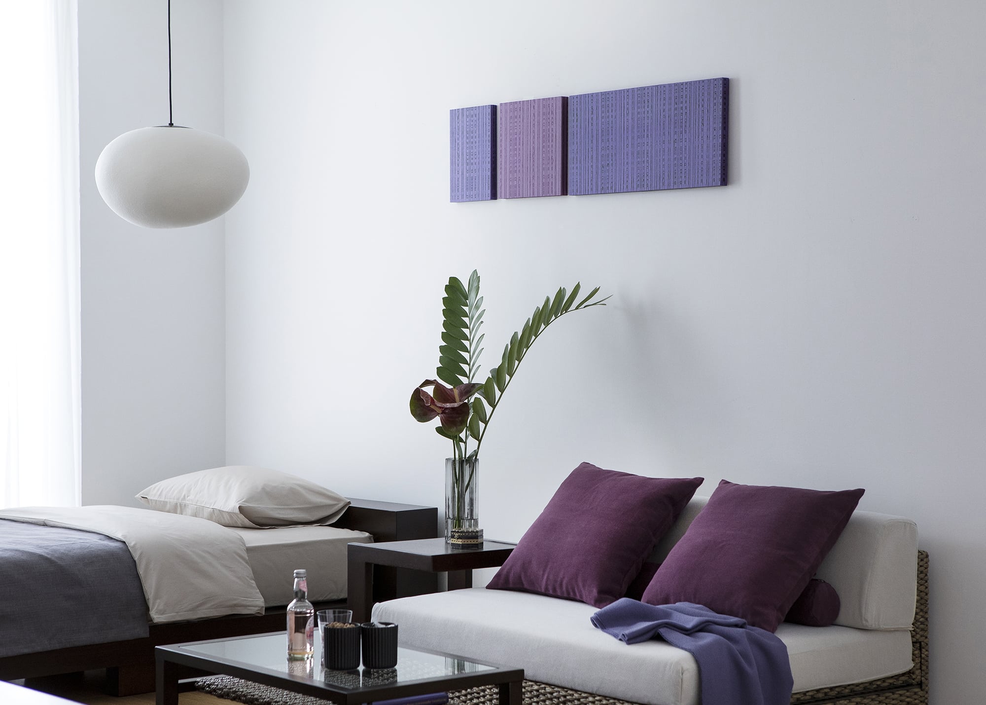 神秘的なパープルを纏ったヒヤシンスソファとのコーディネート例。パープルでまとめたソファ周りに特別感のあるアクセントをアートパネルで演出しています。繊細で上品な幾何学模様によって、リビング全体を洗練された空気感で包み込んでくれるしょう。(写真は3タイプの組み合わせ)