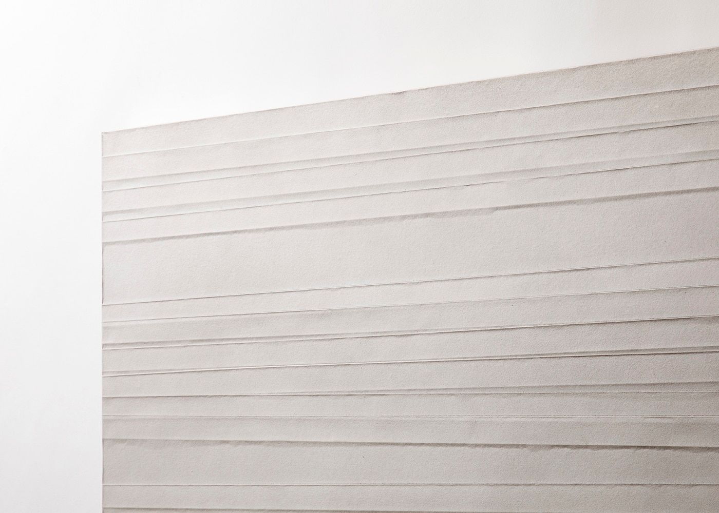 山や海をやさしく包み込む雲霞を日本伝統の折り紙の「折り」と墨で描写したアートパネル (クラウドグレー)。日本三大和紙の1つである「越前和紙」に描いた雲霞の佇まいを眺めるだけで穏やかな気分になります。a.flatが提案する