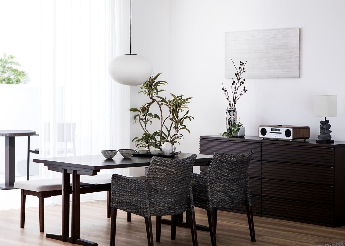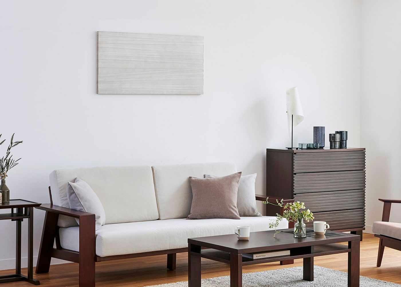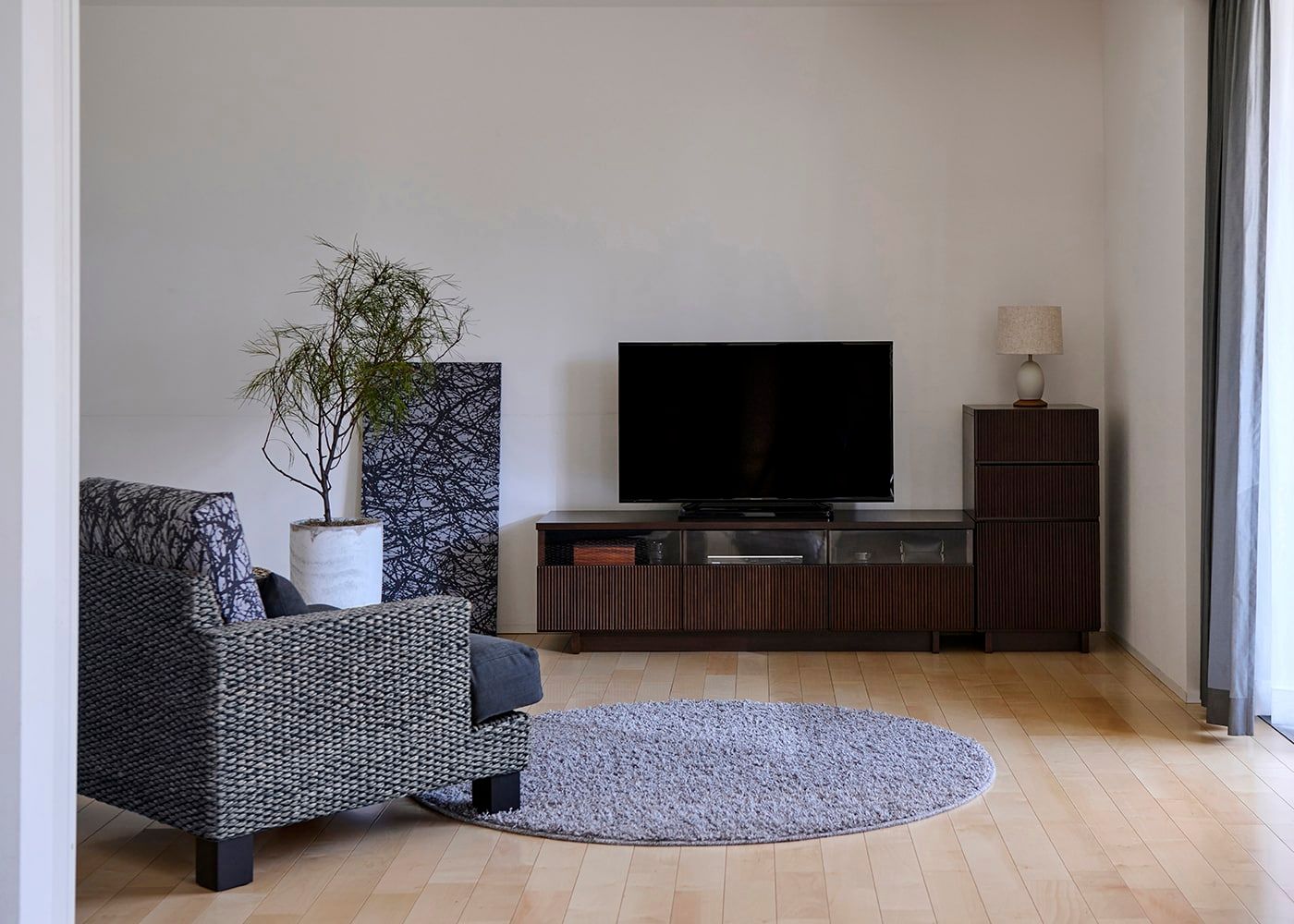 和の佇まいを感じるロースタイルを取り入れた寝室のコーディネート例。アートパネル (クラウドグレー)は、ローベッド脇に配置したルーバーデザインの