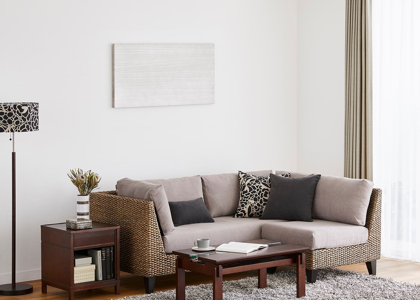 ヒヤシンスのコーナーソファとボタニカル柄のインテリアに合わせたコーディネート例。大人っぽい印象のリゾート風なリビング空間でモノトーンを基調としているため、アートパネル (クラウドグレー)でアクセントをプラス。ソファ周りを引き立てながら、壁面をおしゃれに飾れます。(写真は1000×500タイプ)