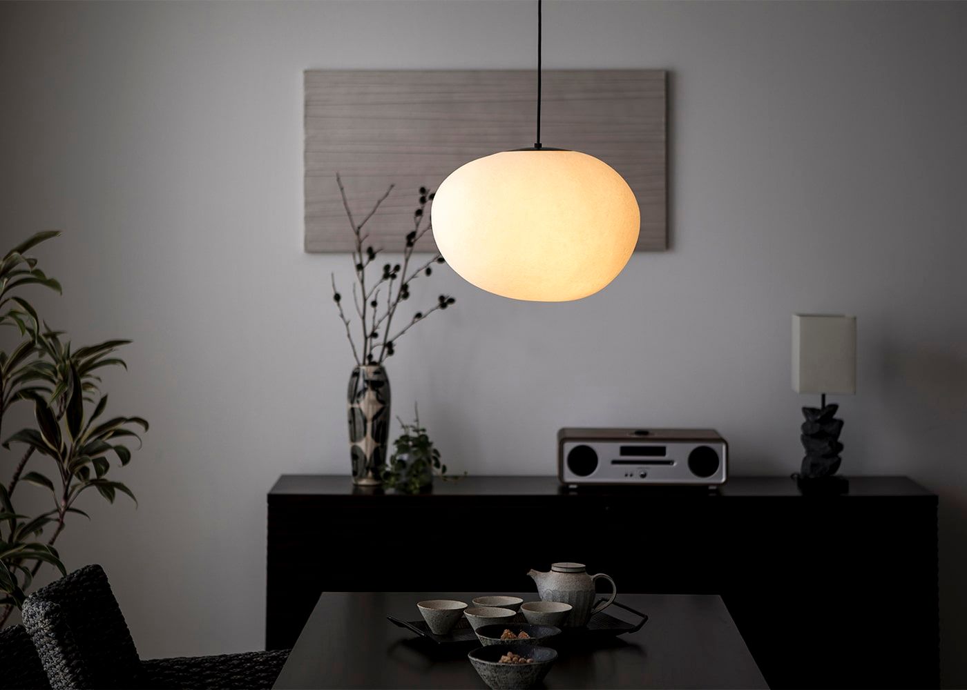 ペンダントライトを合わせてみましょう。ほのかな灯りがアートパネルを優しく照らして、雲霞ような陰影を生み出す情緒的な空間として演出できます。(写真は1000×500タイプ)