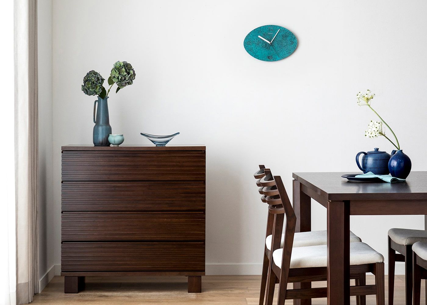 time and space oval Lを飾るだけで、趣のある銅の発色がお部屋のアクセントとなり、凛とした佇まいを演出します。壁飾りとしてのインパクトや時計としての視認性を兼ね備えたちょうど良いサイズです。(サイズは幅 350、高さ235 mm。写真は黒檀)
