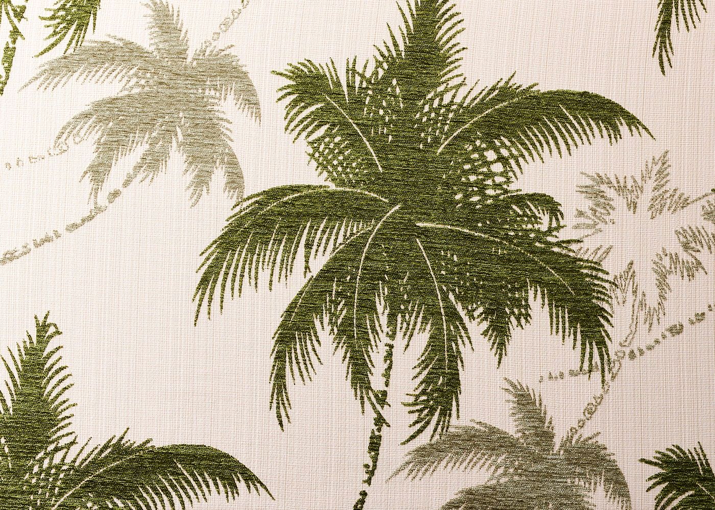 太陽の陽射しに照らされたような、ヤシの大胆で迫力のある情景を想わせるデザインです。葉先まで繊細に描き、海風で揺れるヤシの自然な様をご自宅でも満喫できます。(写真はPRグリーン)