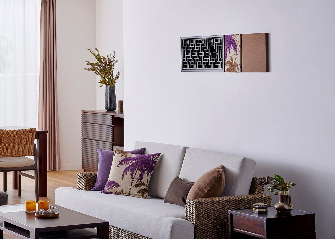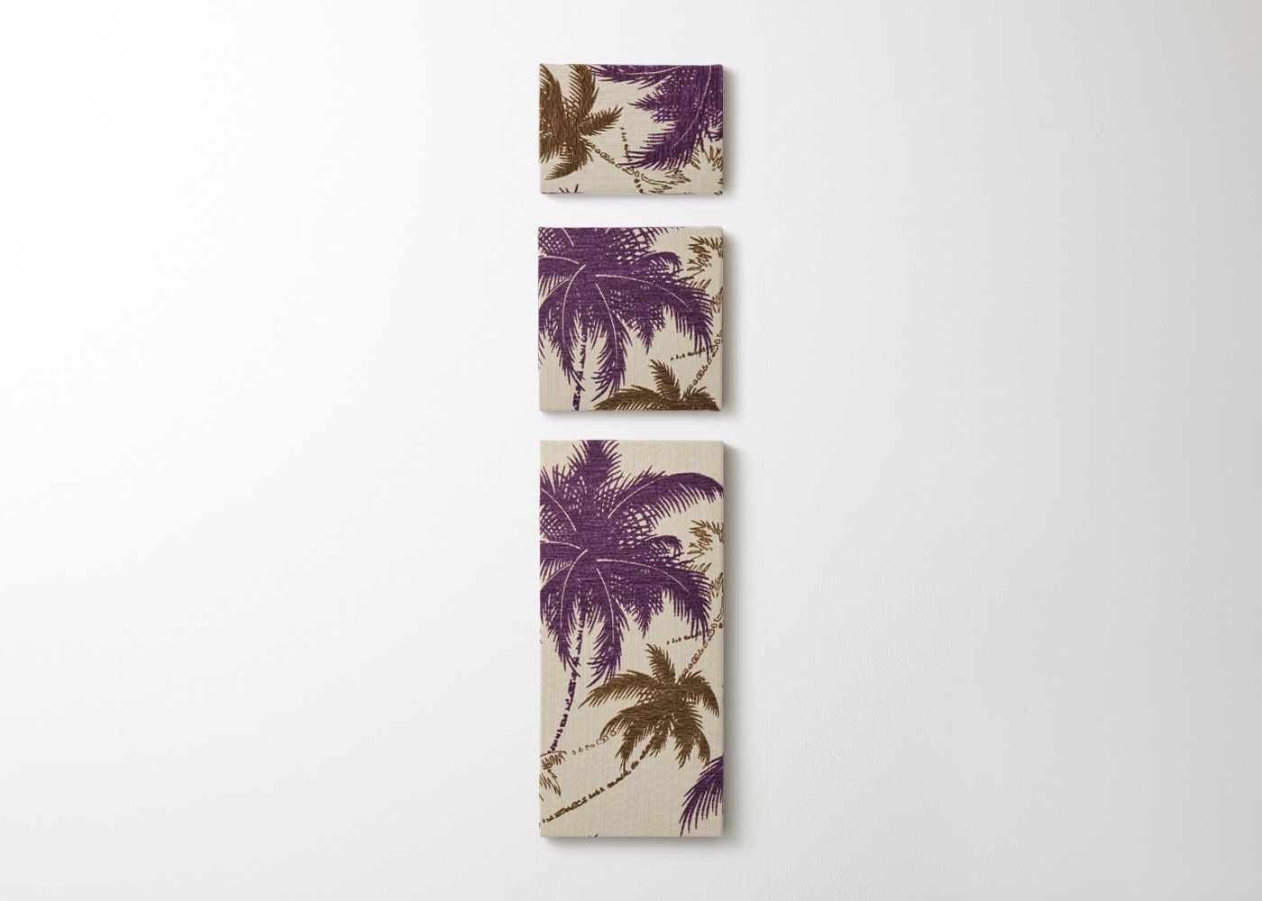 夕暮れ時のヤシがパープルに染まる光景を描いたファブリックパネル(写真中央)です。ソファカバーやクッションカバーと合わせてトータルコーディネートすることで、リゾート地の情緒的な時間帯を味わえる空間を作れます。(写真は左から、