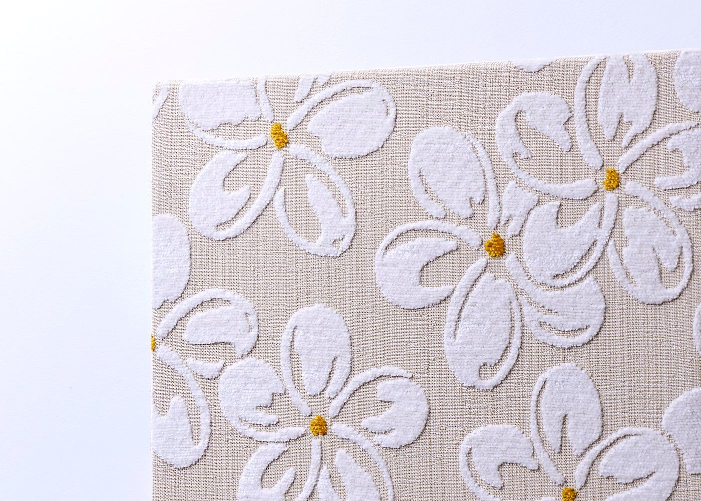 リゾートフラワーとして代表的な「プルメリア」をモチーフにしたファブリックパネル。マットできめ細かなジャガード織りの上に、光沢のあるふっくらしたモール糸で花を大胆に描き、起毛させることで立体感のある表情豊かな生地に仕上げました。さらりとしつつも、やわらかな肌触りとボリューム感が魅力です。