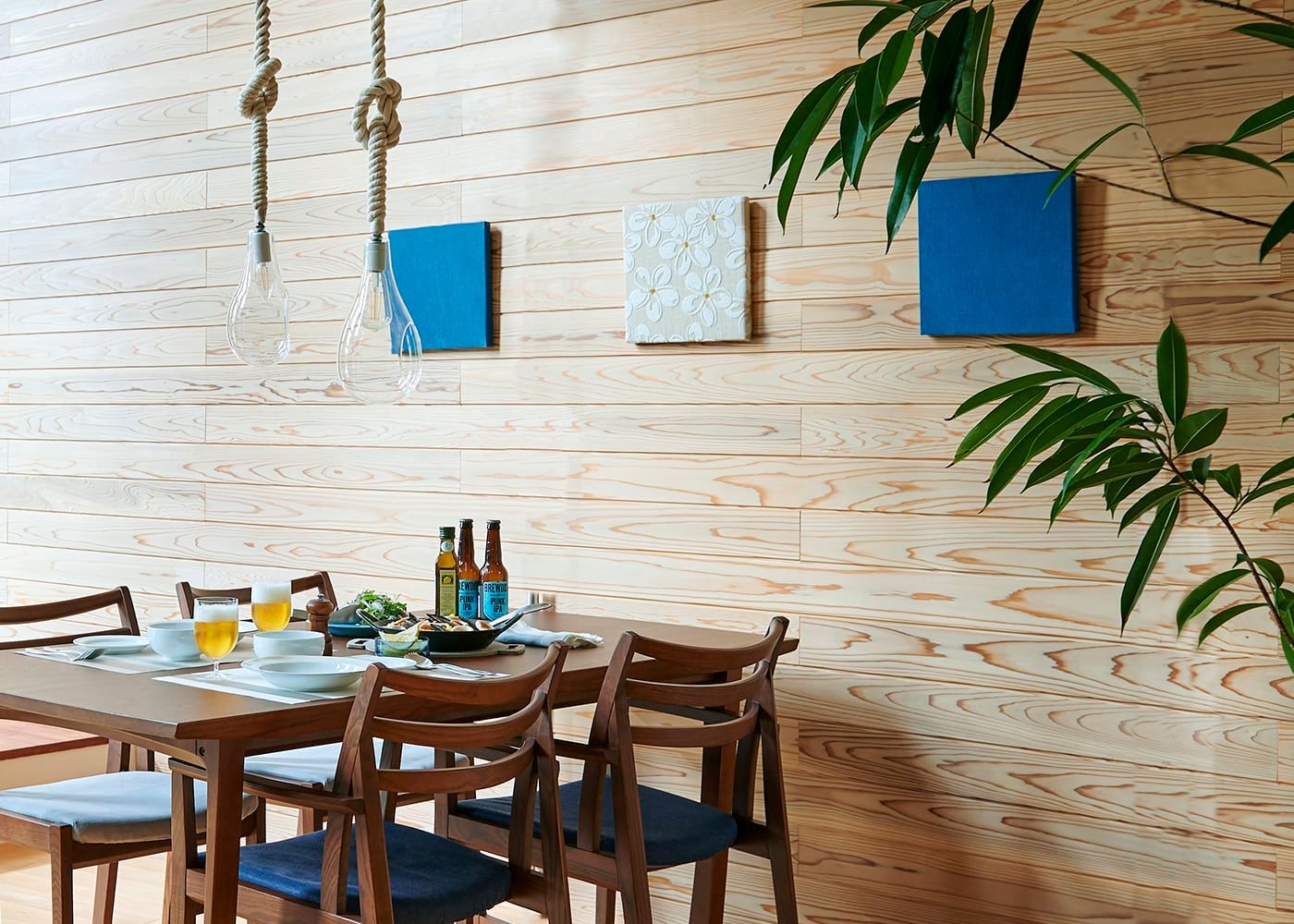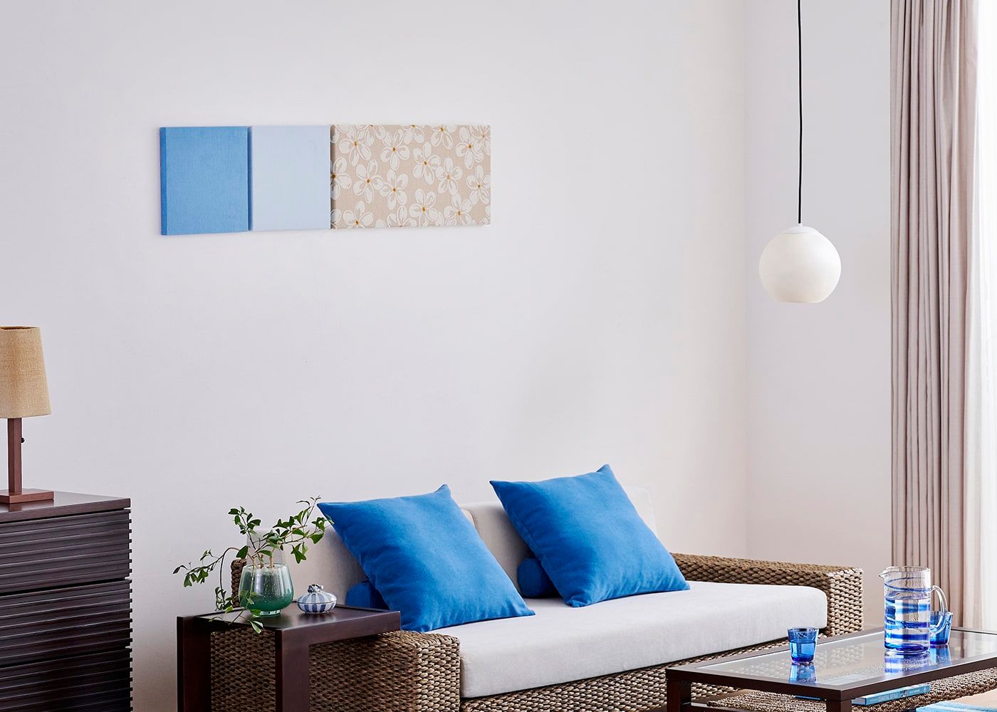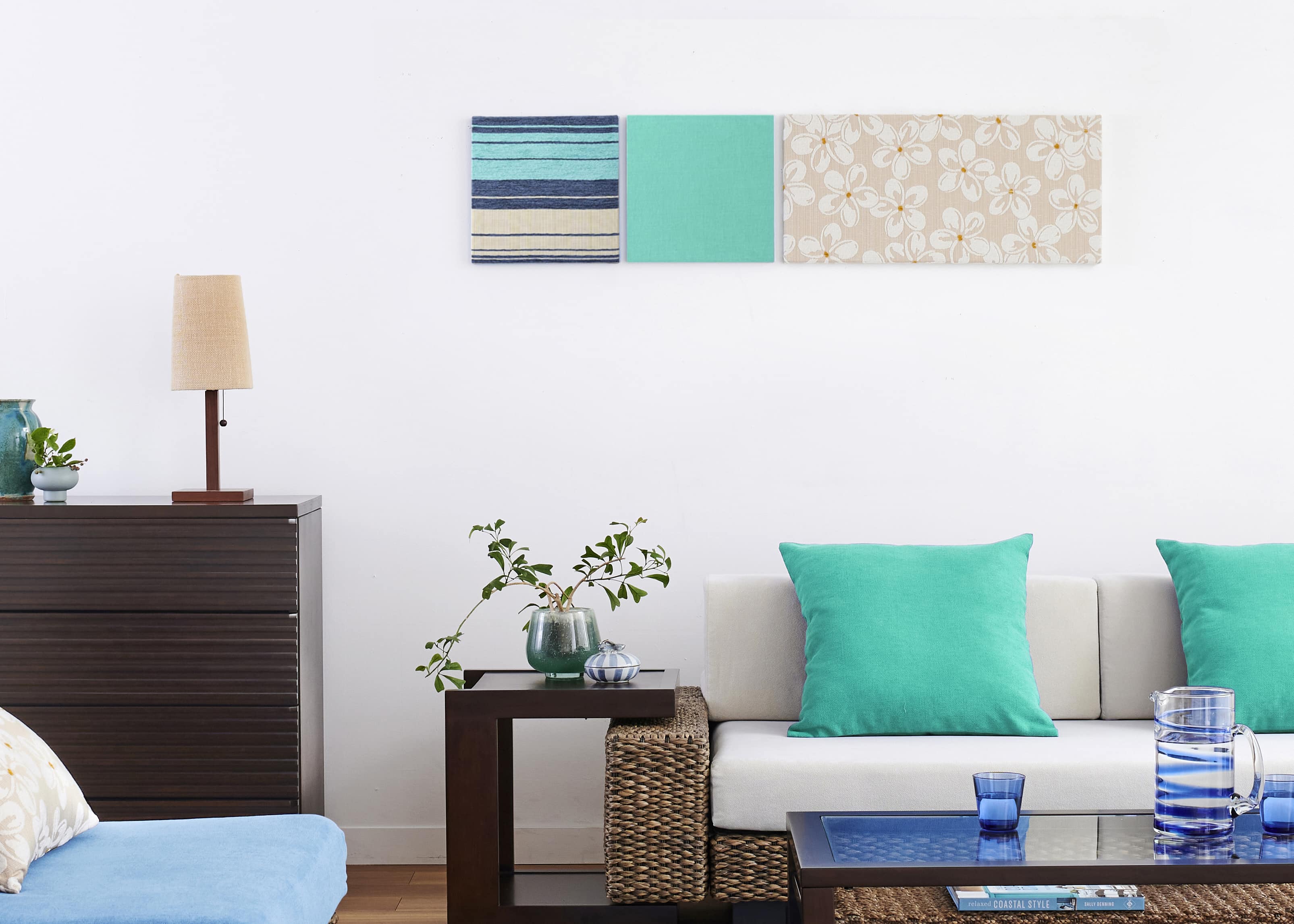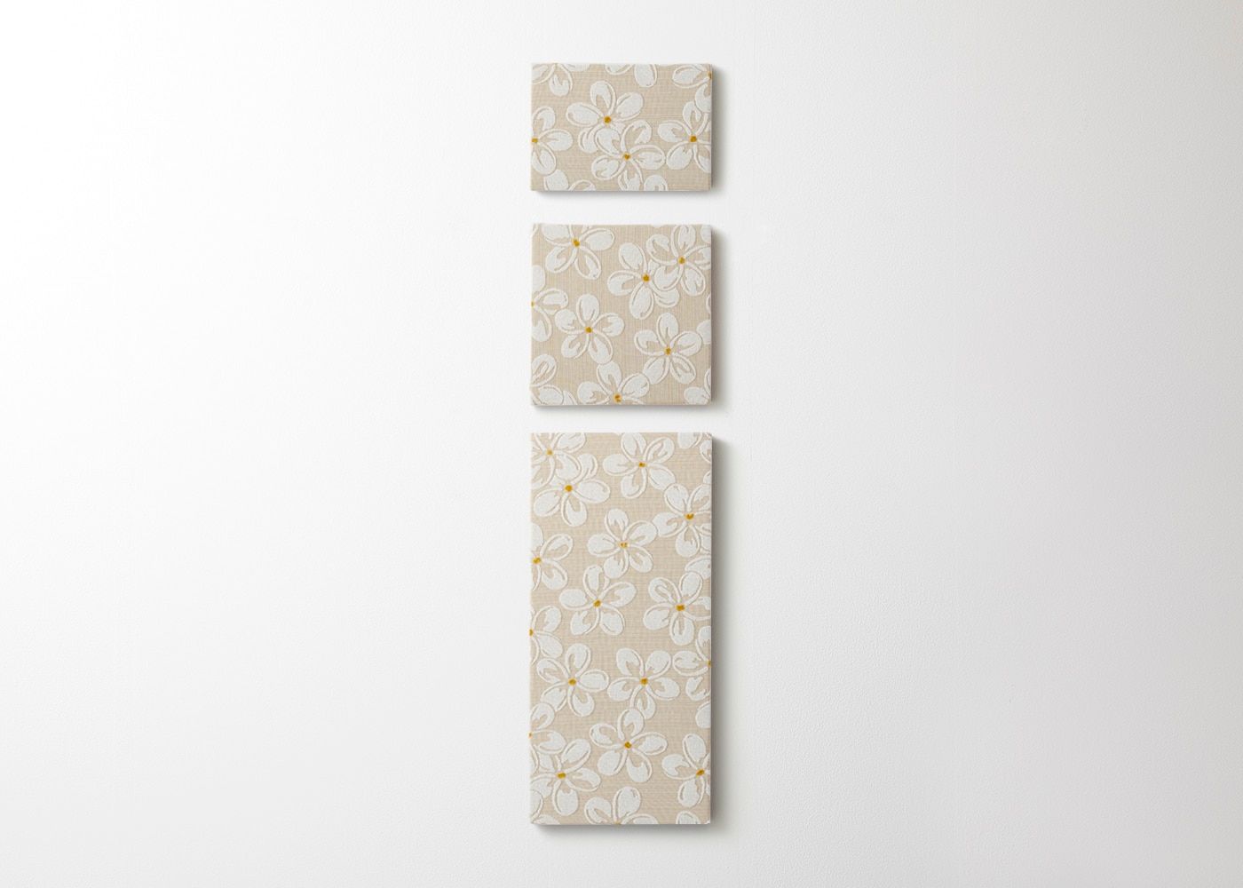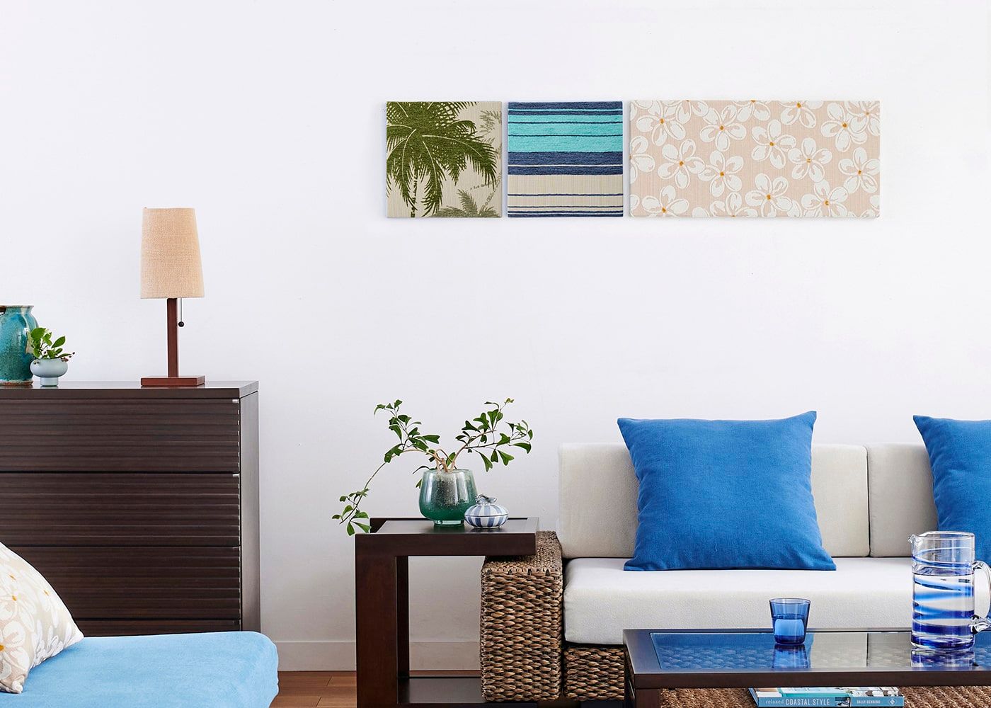 アイランドリゾートに咲き誇る、可愛らしいプルメリア柄のファブリックパネル。爽やかなブルーの壁面装飾と合わせることで、爽やかなハワイアンインテリアが叶います。(写真は左から、