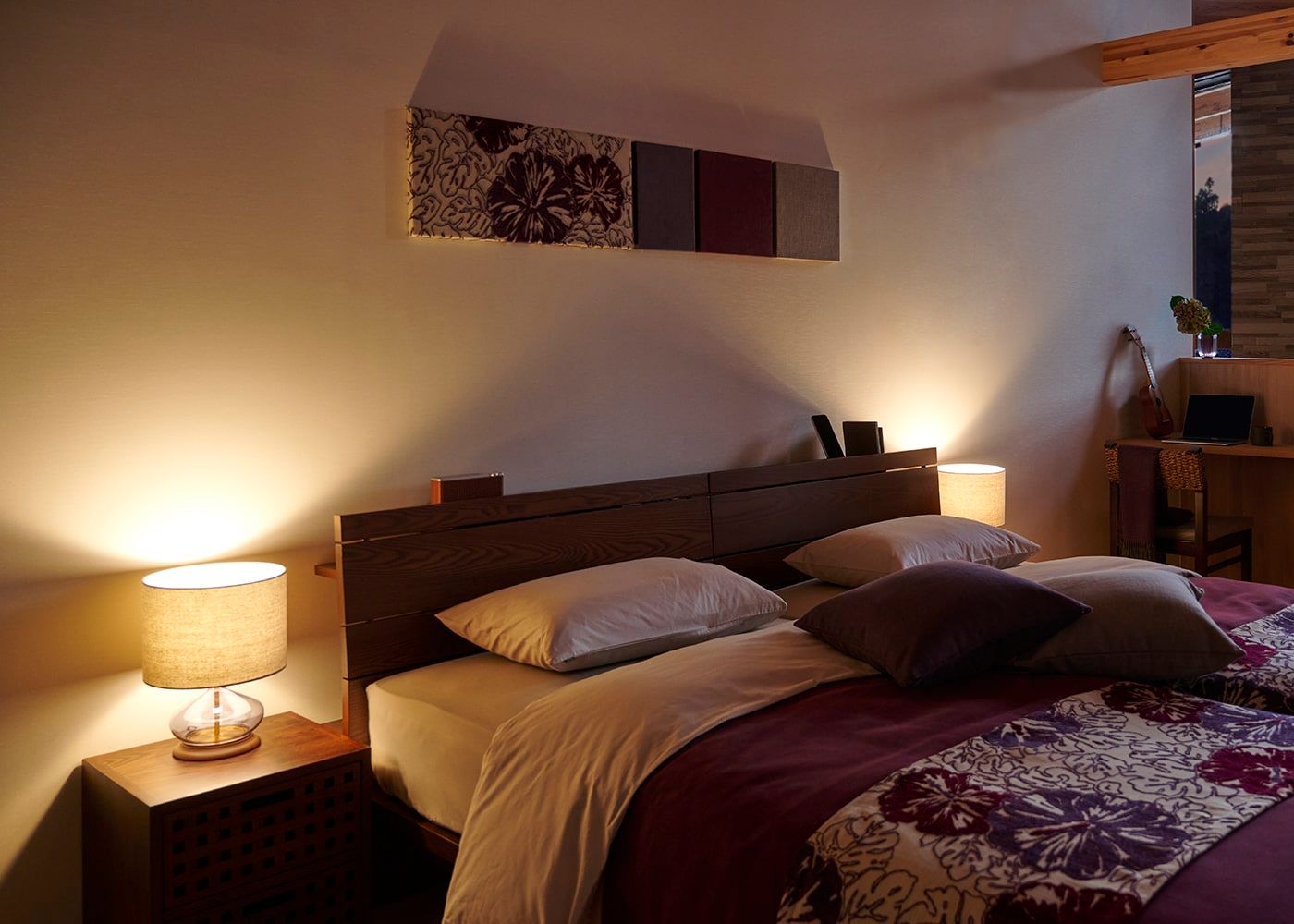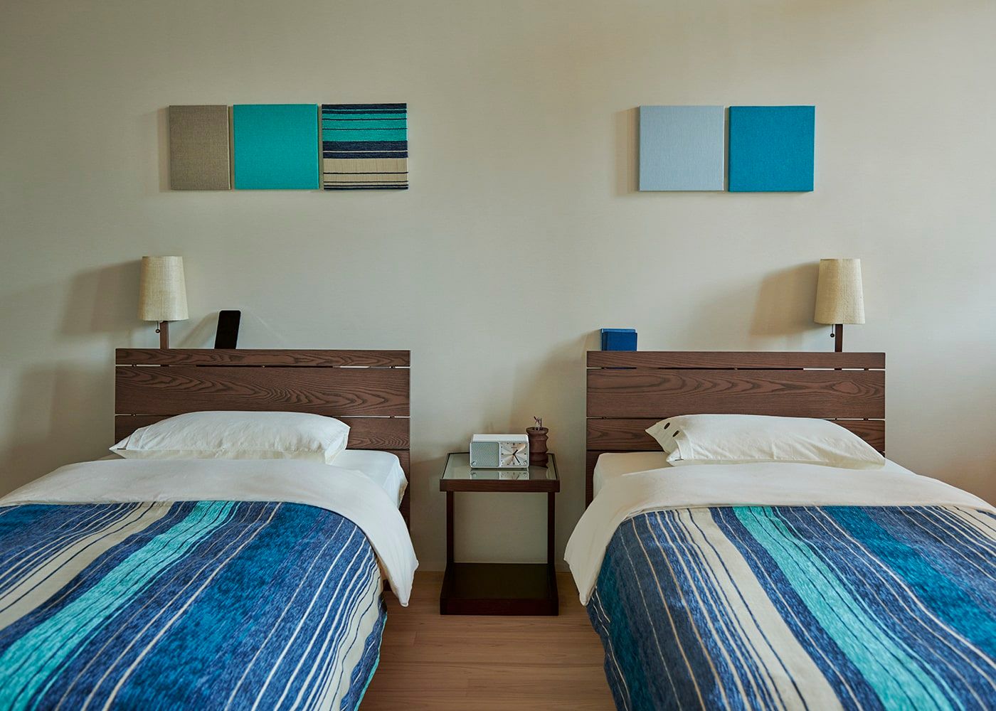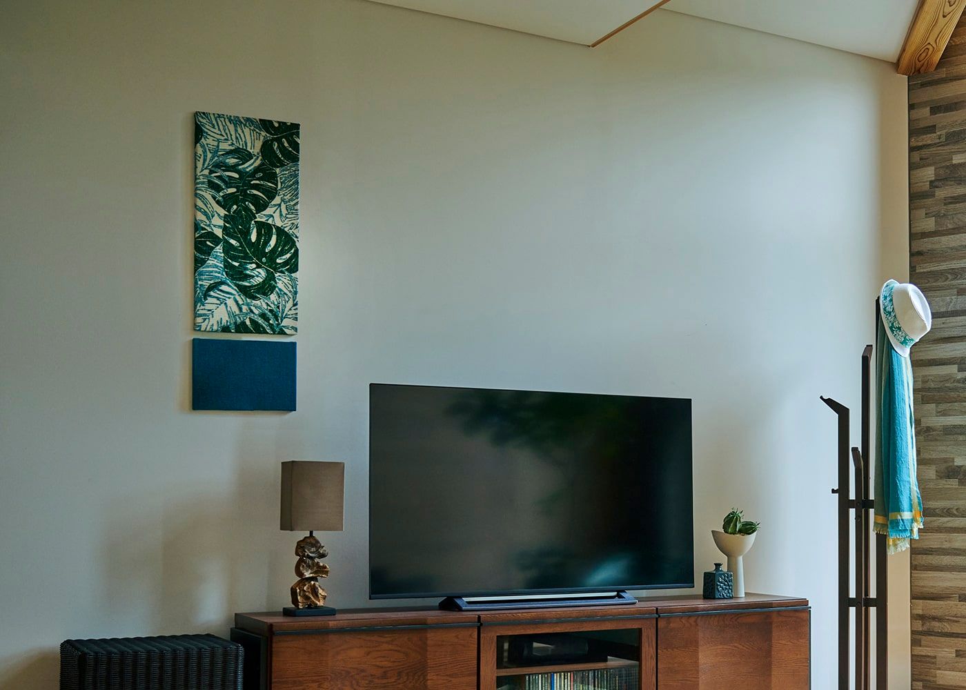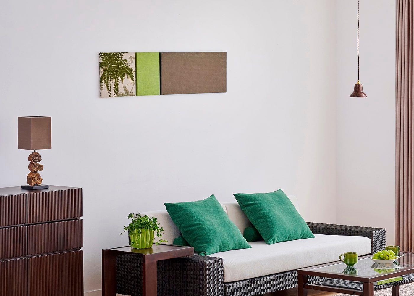 海辺のリゾート地にそびえる、昼時の雄大なヤシをイメージしたファブリックパネル(写真左)です。相性の良いリラックス感のあるグリーンや落ち着いたブラウンのパネルと合わせれば、フォレストリゾートのような空間を演出できます。(写真は左から、PRグリーン 300×300、