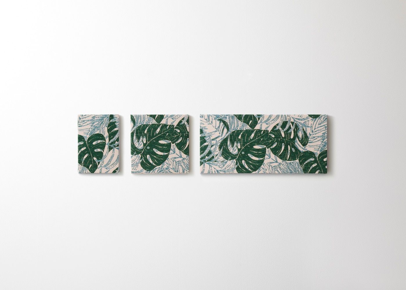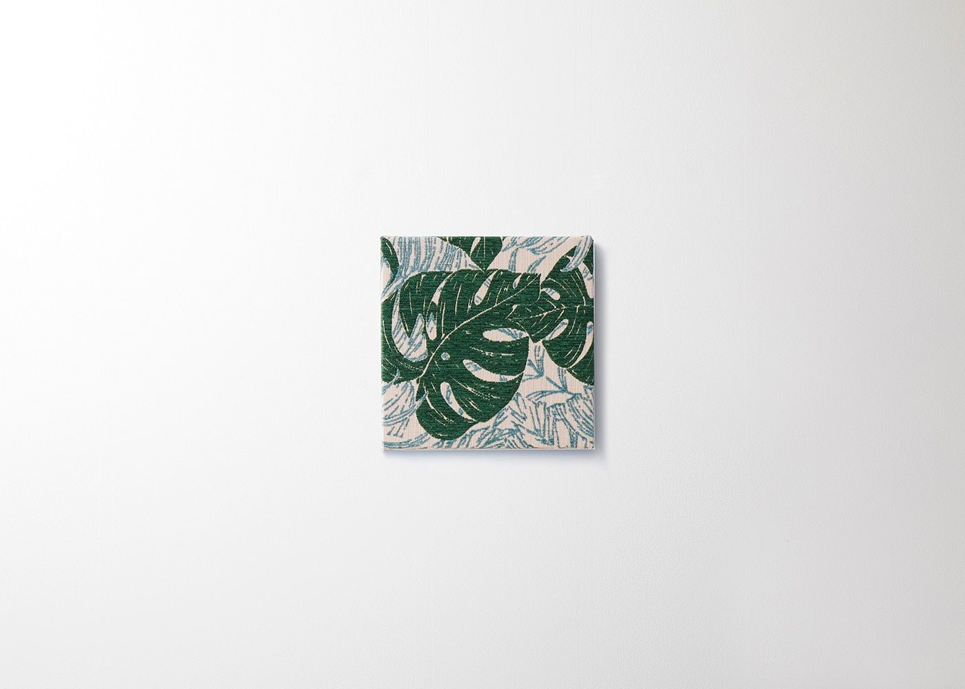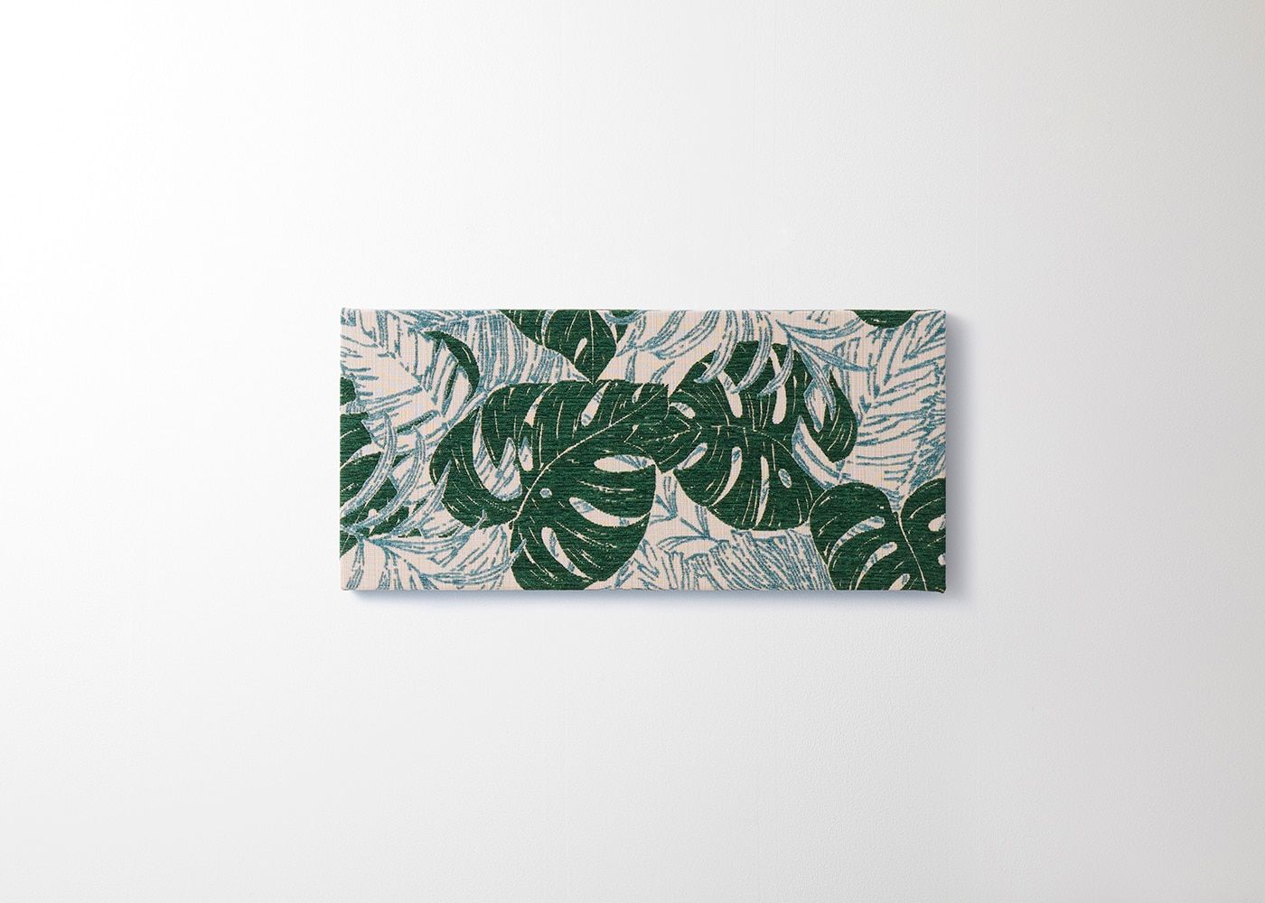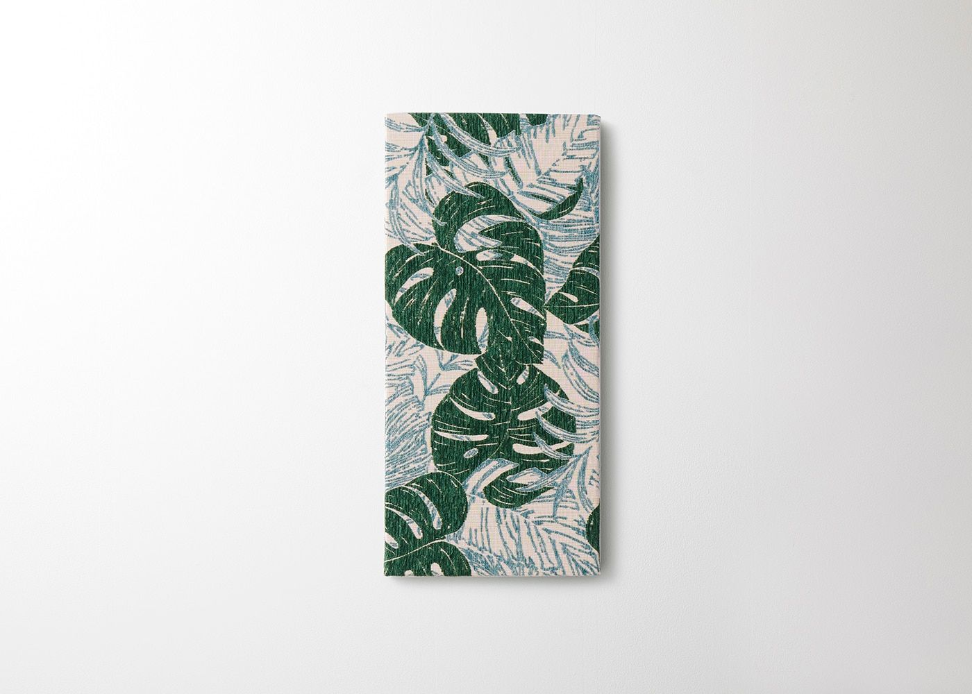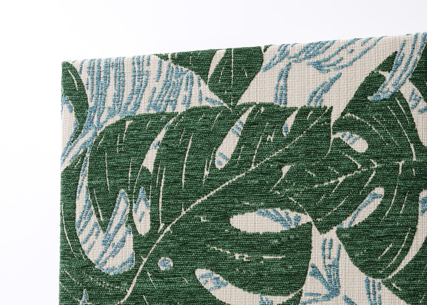 リゾートの空気感を叶えてくれる大きい葉柄の「モンステラ」を描いたa.flatオリジナルのファブリックパネルです。下側には相性が良いヤシやオーガスタなどをさりげなく描き、立体感と奥行き感のある自然の情景をデザインしました。(写真はMSグリーン)