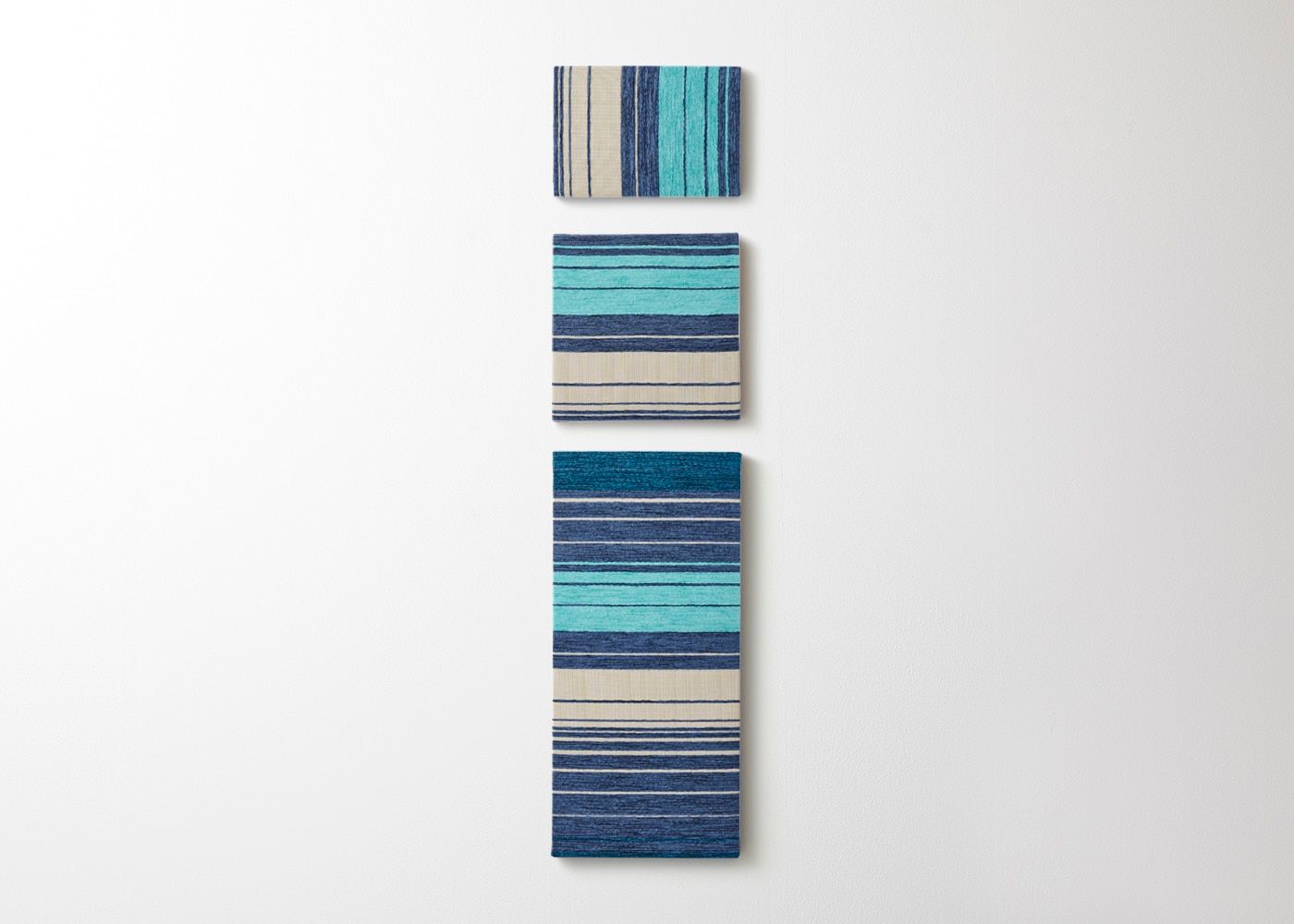 3タイプのサイズ感の比較です。飾る壁面に合わせてお好きなサイズや組み合わせをお選びください。(写真はILブルー。左から、 210×300タイプ、300×300タイプ、650×300タイプ。横使い)
