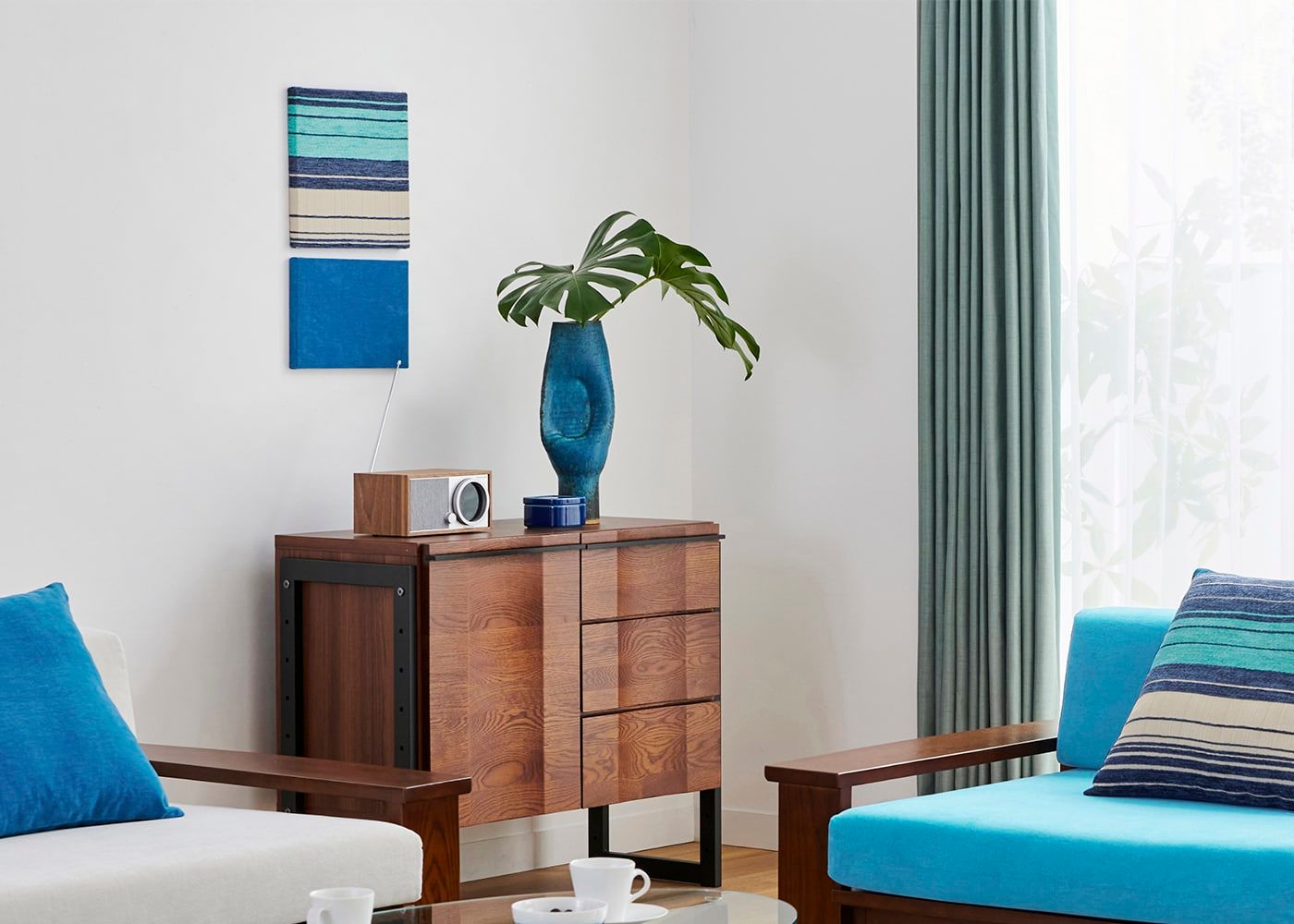 300×300タイプは、壁面のスペースを選ばないサイズ感が魅力。単品使いはもちろん、広いスペースに複数並べて飾ると、リズム感のある壁面を演出できます。壁に穴が開けられない方は、キャビネットや収納棚の上に置いて飾るのもおすすめです。(写真はPUブルー