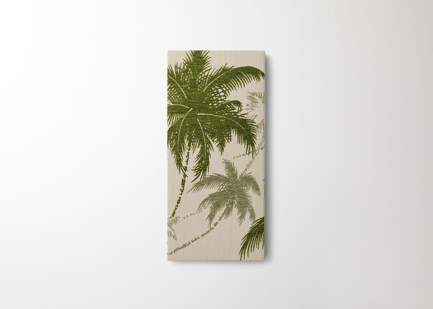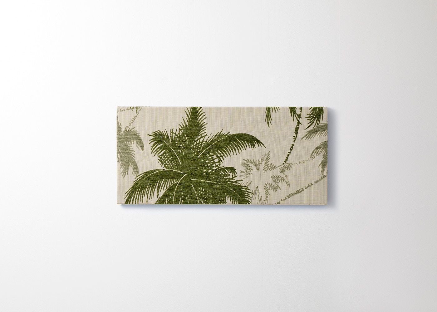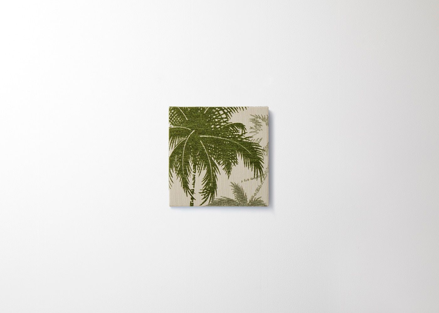 パームは大小のヤシを面と線で細かく描き、立体感と奥行き感のある風景をデザインしたa.flatオリジナルのファブリックパネルです。さらりとしつつも、やわらかな肌触りとボリューム感を味わってください。(写真はPRグリーン)