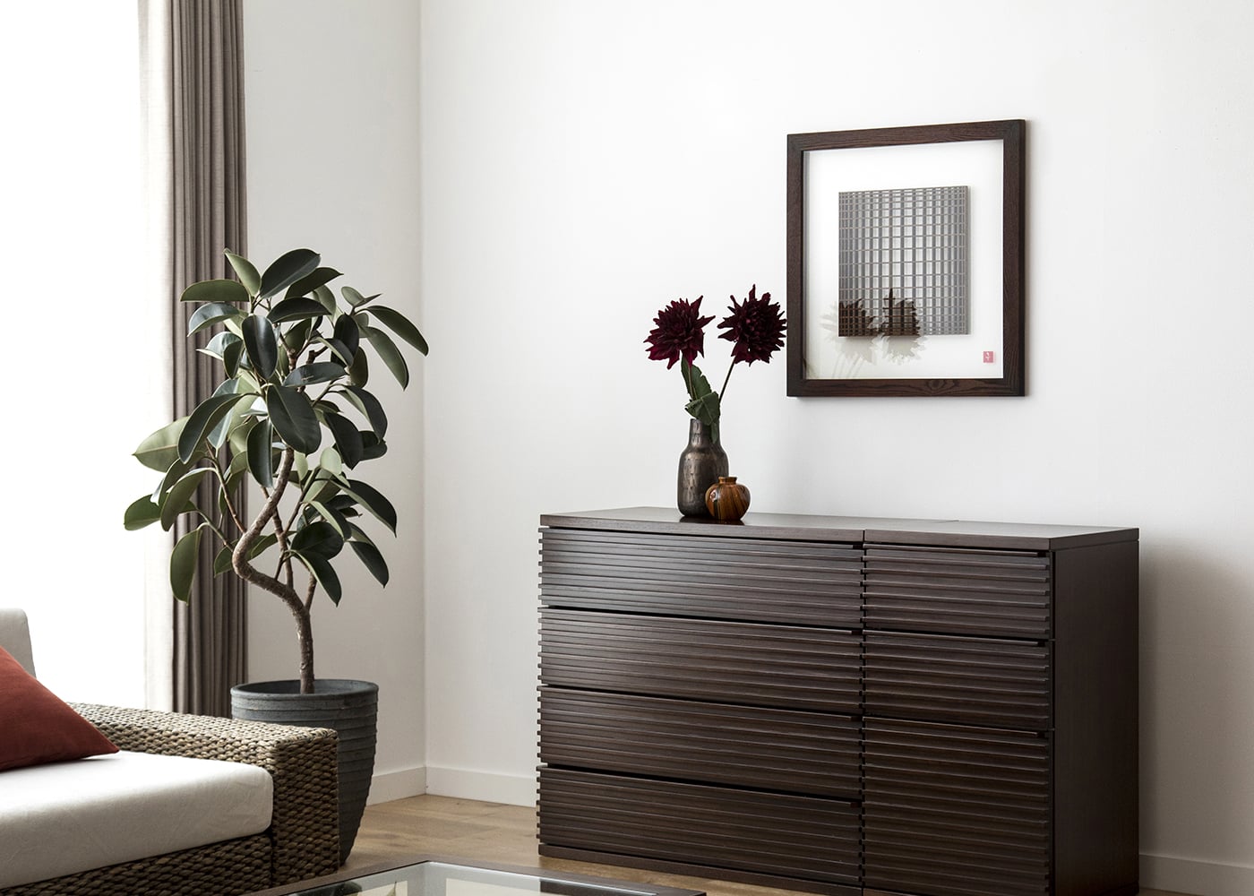 タモ材を黒く染めることで、無垢材ならではの素材感と洗練さを兼ね備えた表情に。飾るだけでシックで落ち着きのあるお部屋に仕上がります。(写真はブラック)