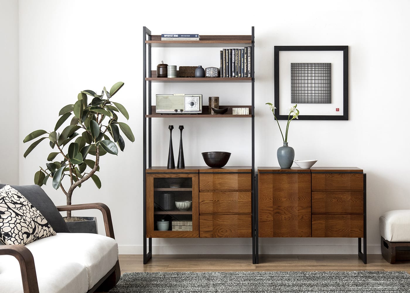 600×600タイプは、リビングボード上の壁面にぴったりです。収納家具のアイアン脚に合わせたブラックでコーディネートすると、無垢材の温もりの中にもシックな印象の空間に。(写真は600×600タイプ ブラック。