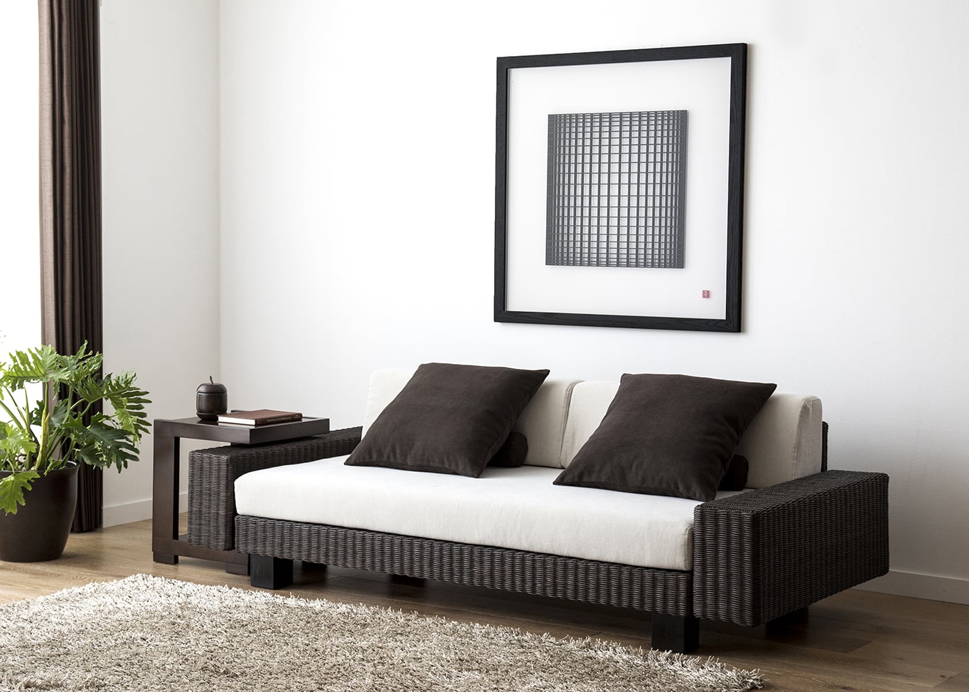 900×900タイプは、広く空きがちなローソファ上の壁面も彩ります。リビングの主役のローソファとコーディネートすることで、落ち着いた中にもインパクトのある一味違った空間に仕上がります。(写真は900×900タイプ ブラック。