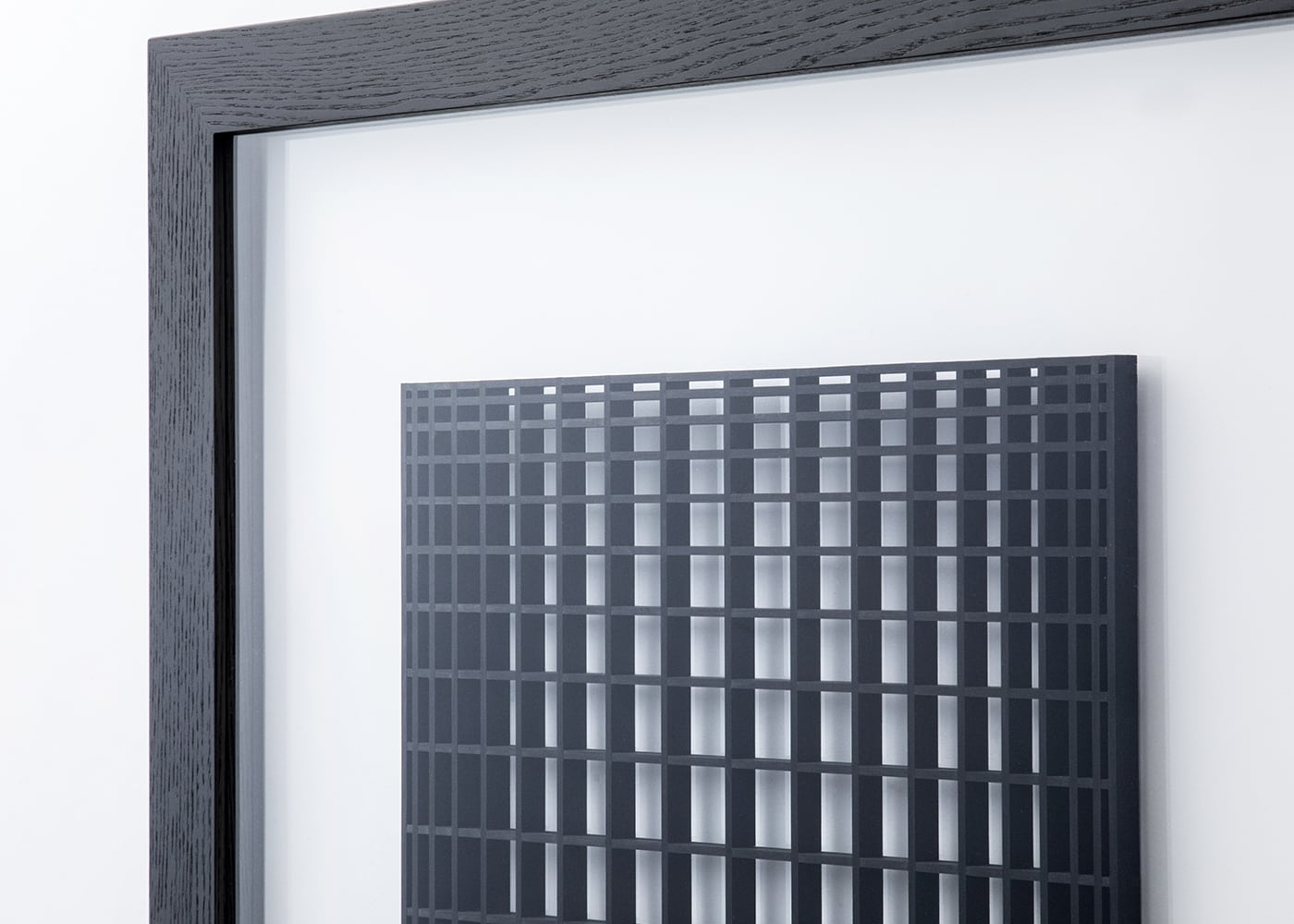 存在感のある900×900タイプは、そのまま床に置いて飾るだけでお部屋の雰囲気を変えてくれます。壁掛けよりも簡単にワンランク上の空間を演出できるのも魅力。まるで格子が浮いているかのようなデザインも特長の1つです。(写真は900×900タイプ ブラック)※販売終了