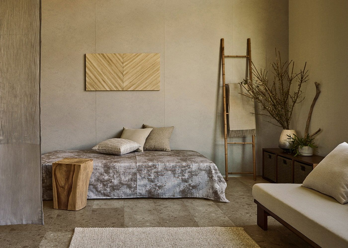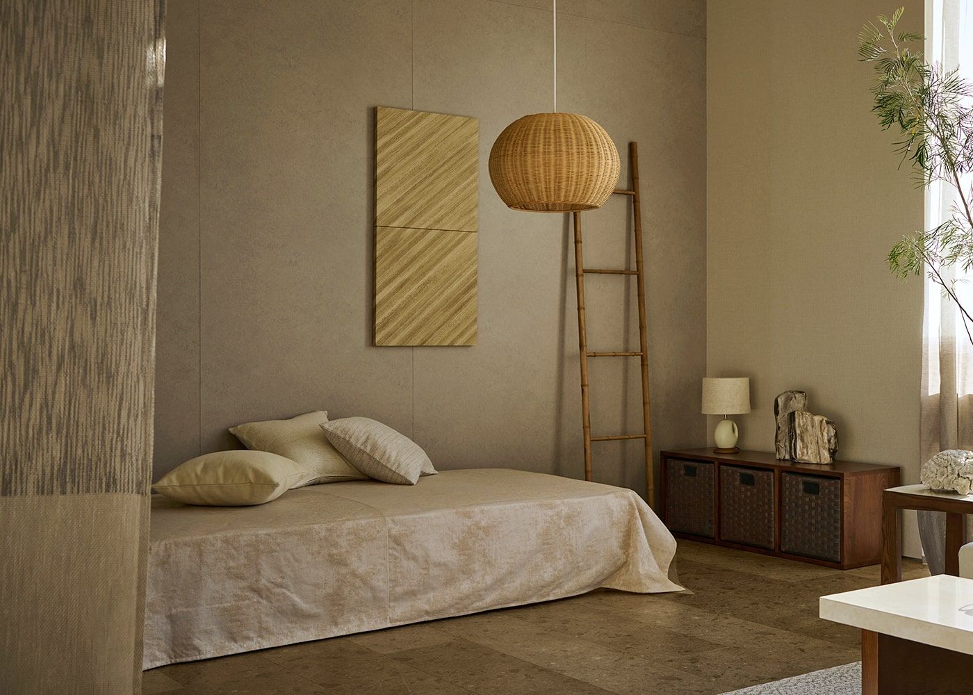 日本の和紙では実現できないこの凹凸感のある和紙は、東南アジアの工房で1枚1枚丁寧に作られています。楮(こうぞ)とアバカを絶妙なバランスで調合し、左官技術である櫛引きを施すことで地層のような立体感のある表情に。