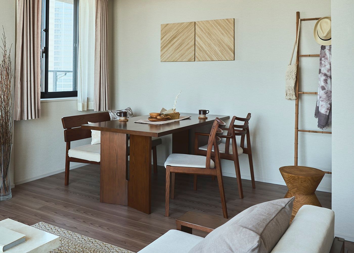 パネルを2枚を少し離して並列に飾ることで、リビングとダイニングの間のちょっとした壁面スペースもおしゃれな雰囲気に。