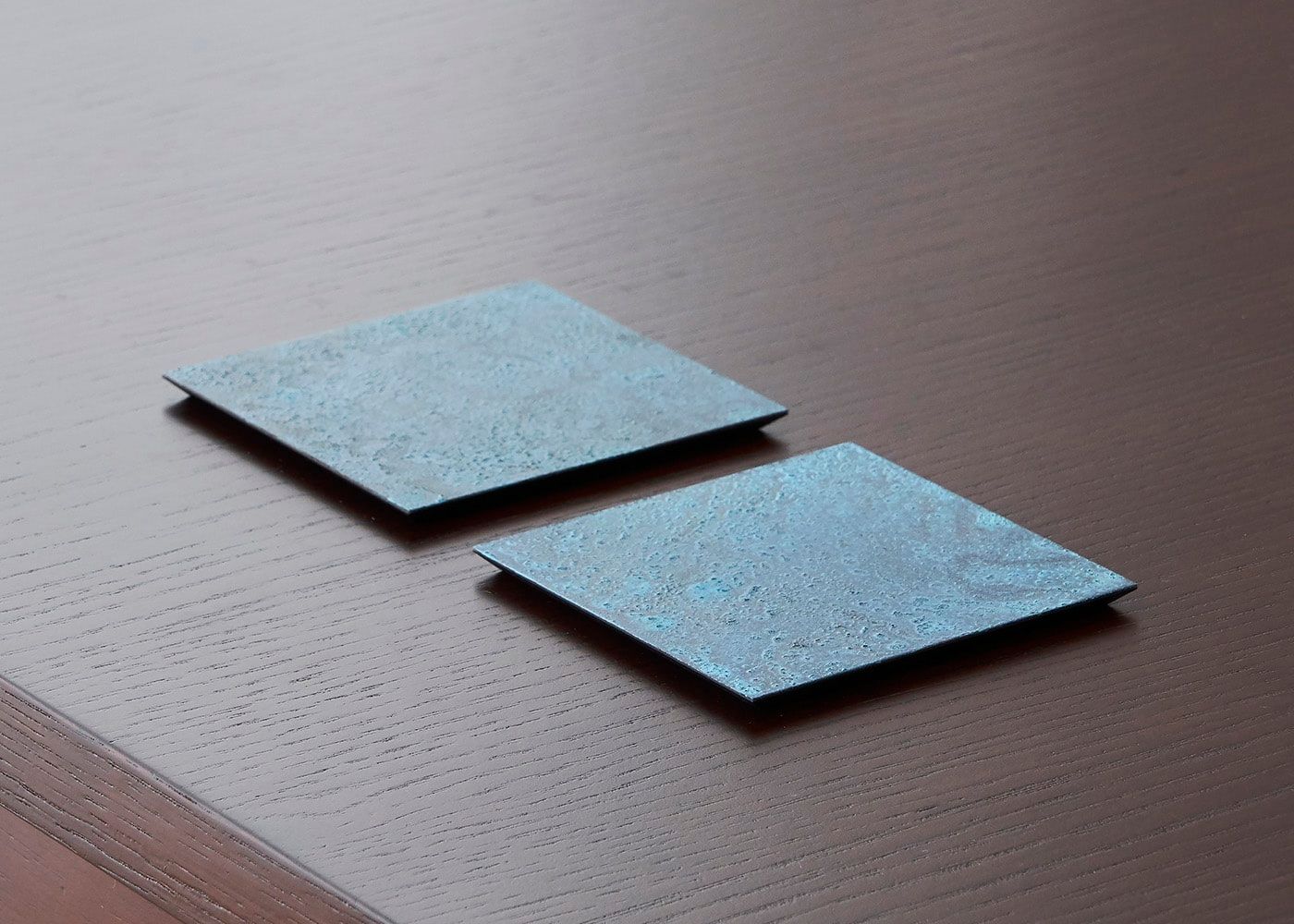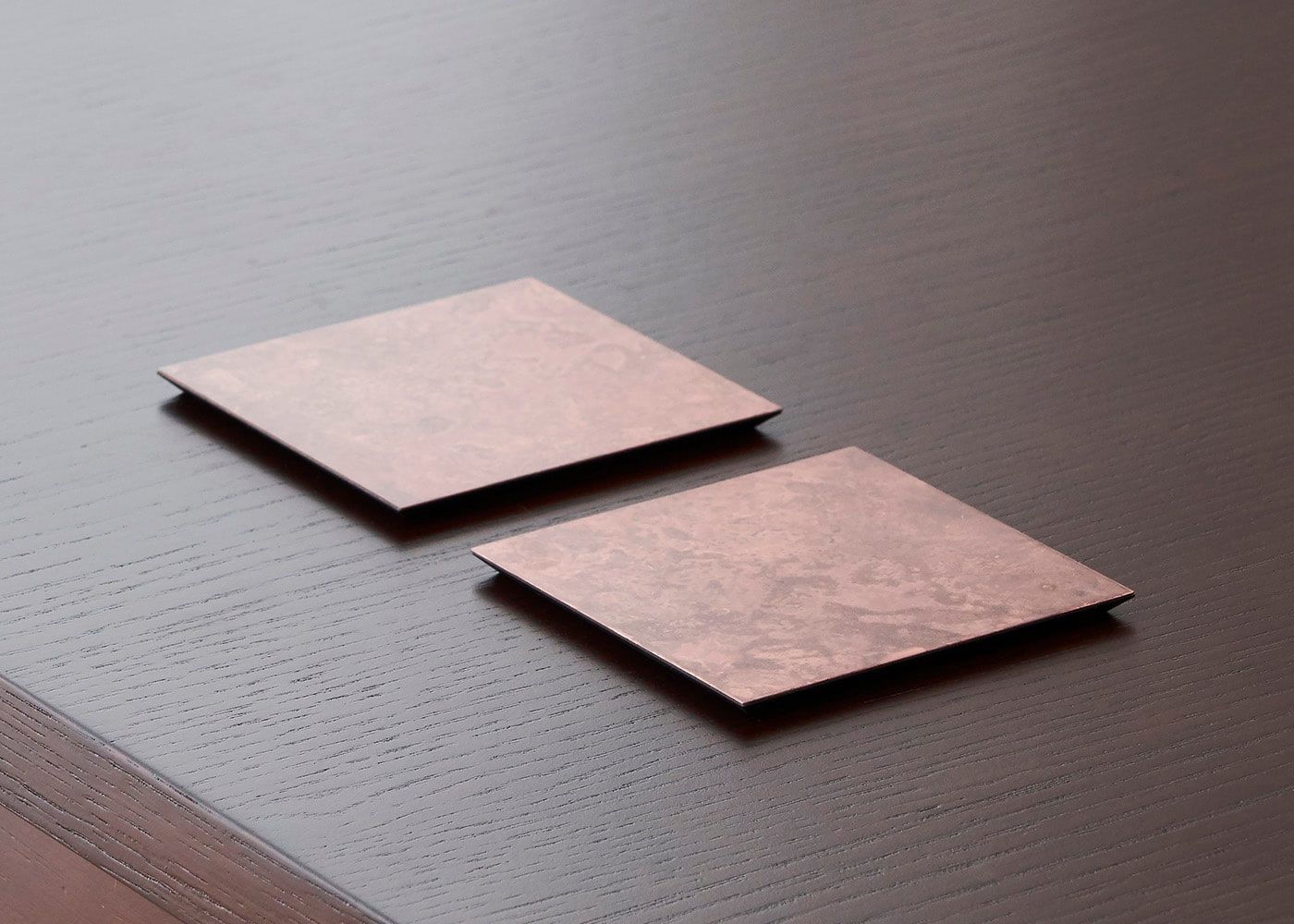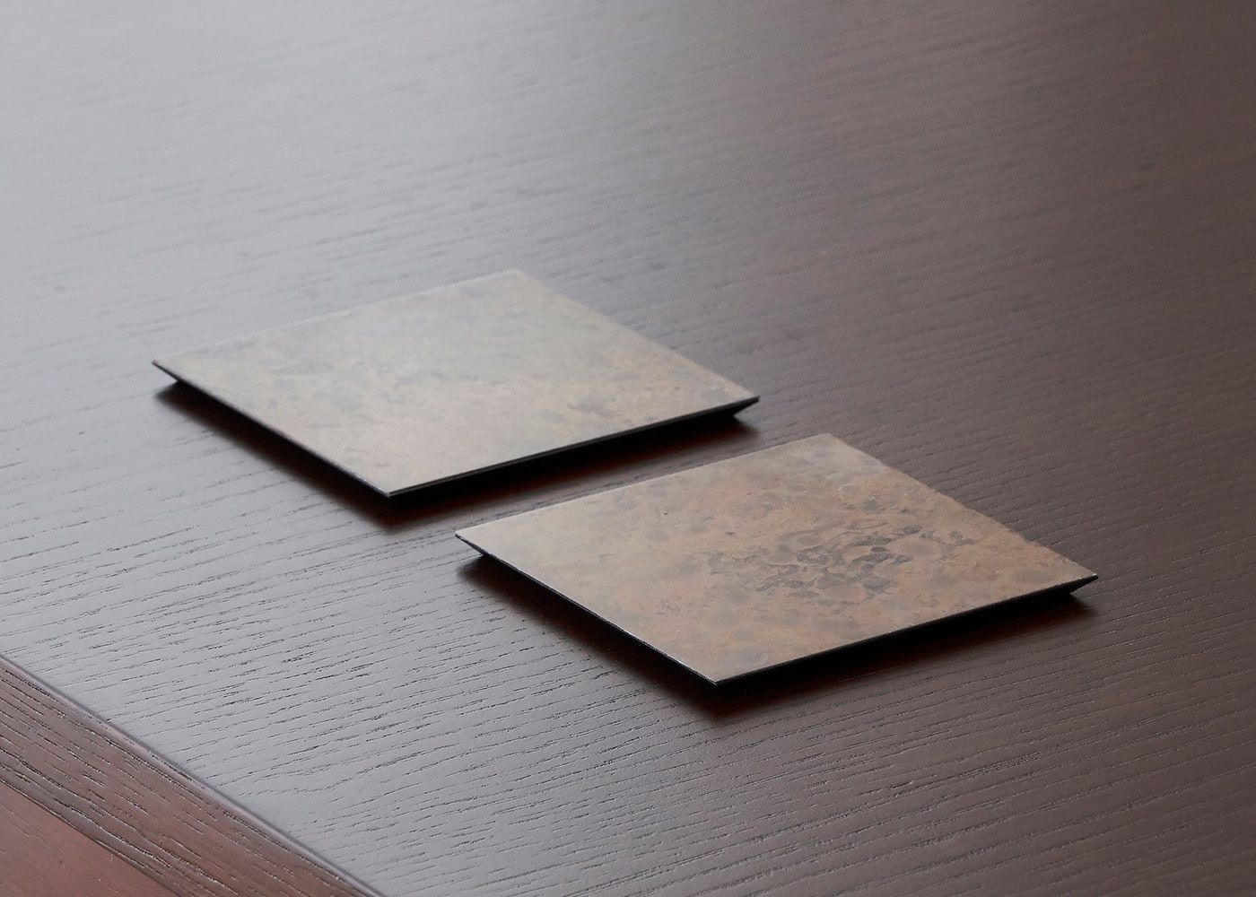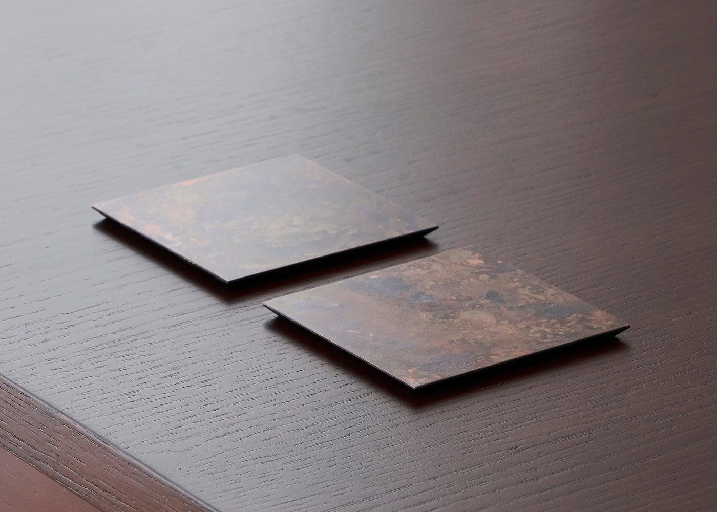 塩化アンモニウムや硫酸銅の溶液を用いたり、大根下ろしや糠みそなどを塗ってバーナーで焼いたりと、色によって多種多様な技法を生み出しています。金属素材の腐食や錆という特性を生かした、唯一無二の質感や風合いをお楽しみください。(写真は黒檀)