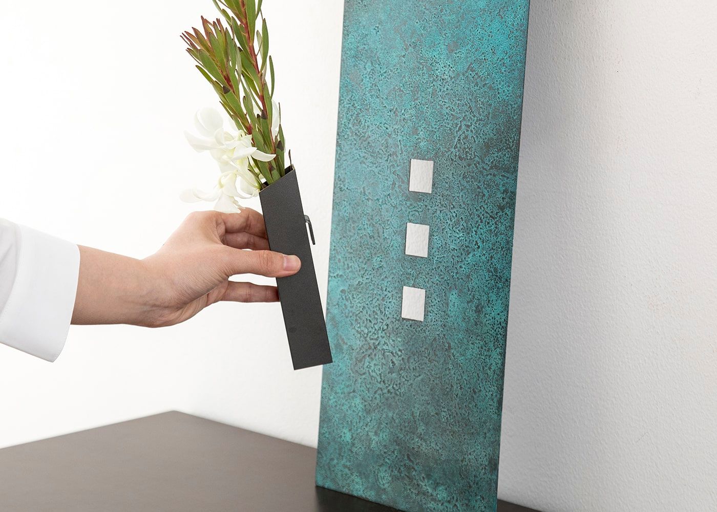 日本を代表する伝統工芸「高岡銅器」の着色技術が織りなす、色鮮やかな発色が堪能できる壁掛け花器・on the wall。飾るだけで空間に凛とした佇まいを感じさせます。一輪挿しの花と銅の美しい色が、a.flatの家具に彩りを与えてくれる壁掛け花器です。