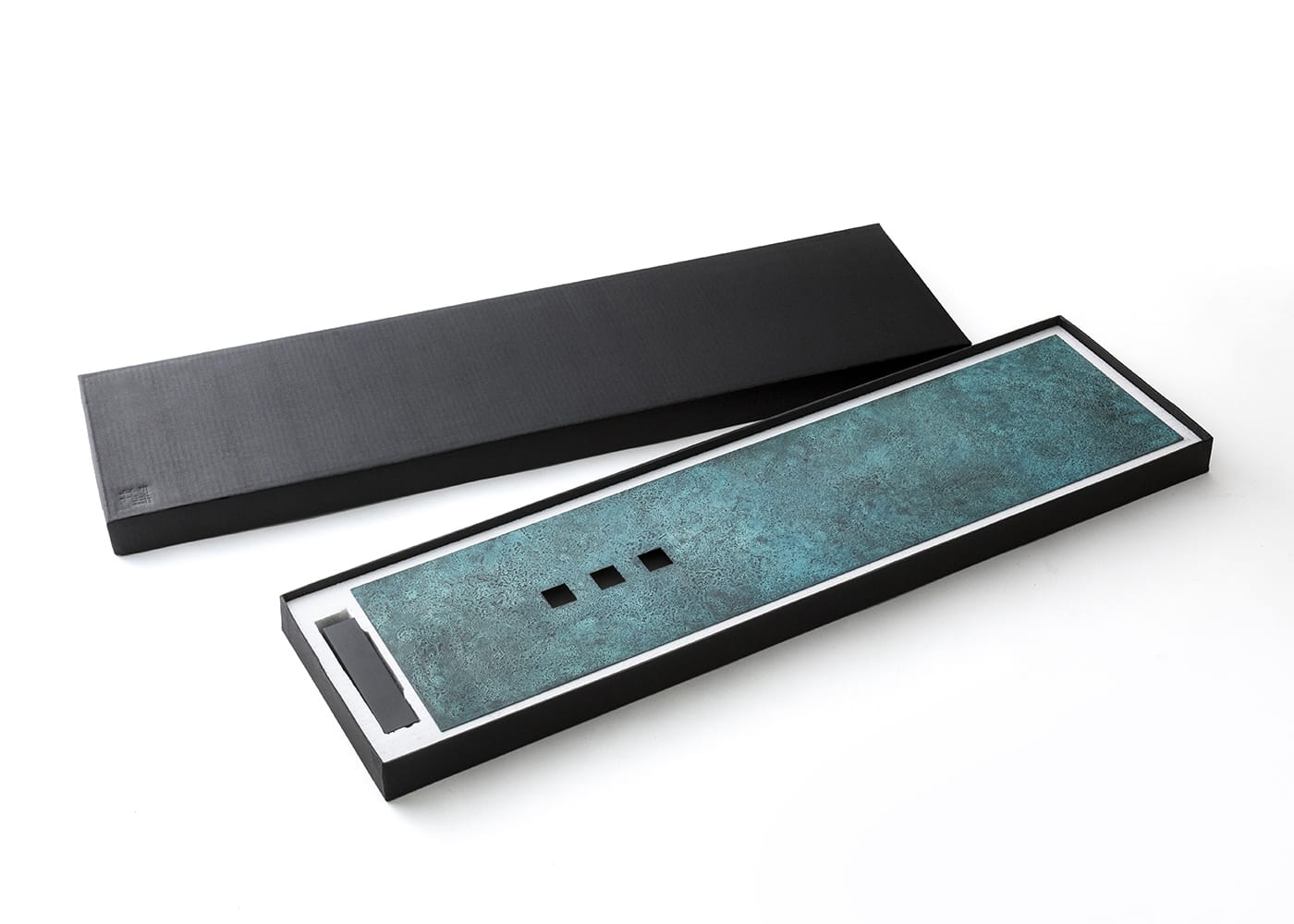 400年もの伝統のある富山県の伝統工芸「高岡銅器」。現代の伝統工芸士により、長年培われた着色技術をさらに進化させた独自の発色法を確立しました。例えば、塩化アンモニウムや硫酸銅の溶液を用いたり、大根下ろしや糠みそなどを塗ってバーナーで焼いたりと、色によって多種多様な技法を生み出しています。金属素材の腐食や錆という特性を生かした、唯一無二の質感や風合いをお楽しみください。(写真は花緑青)