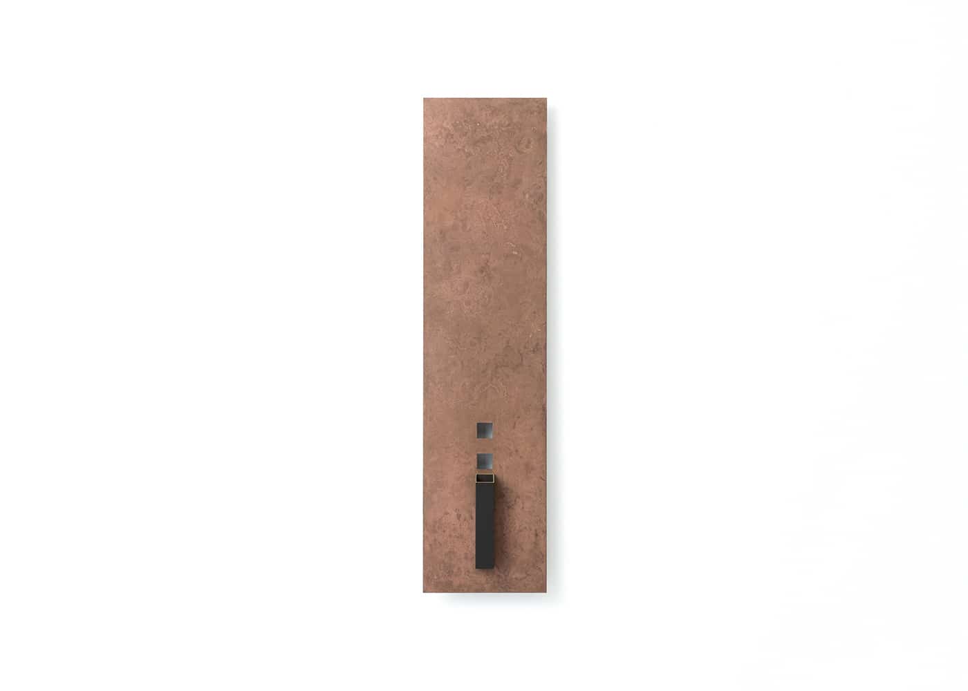 本体に開けられた3つの穴は、一輪挿しの花器を引っ掛けるためのもの。一輪挿しとして使用するのはもちろん、この穴をデザインとして、花器を使わずに銅の美しい発色を純粋に楽しむタペストリーとしても使えます。