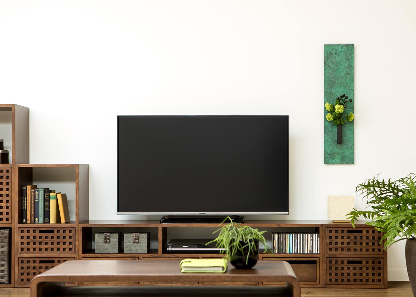 テレビボード周りの広い壁面にon the wallを飾ったコーディネート例。職人の手作りによる多彩なカラーが織りなす壁掛け花器は、お気に入りのスペースを鮮やかに彩ってくれます。(写真は孔雀)