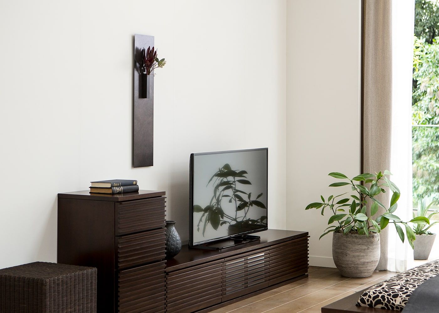 ルーバーシリーズ収納と相性の良い黒檀。どんなカラーコーディネートにも合わせ易いシックな発色です。(写真は黒檀)