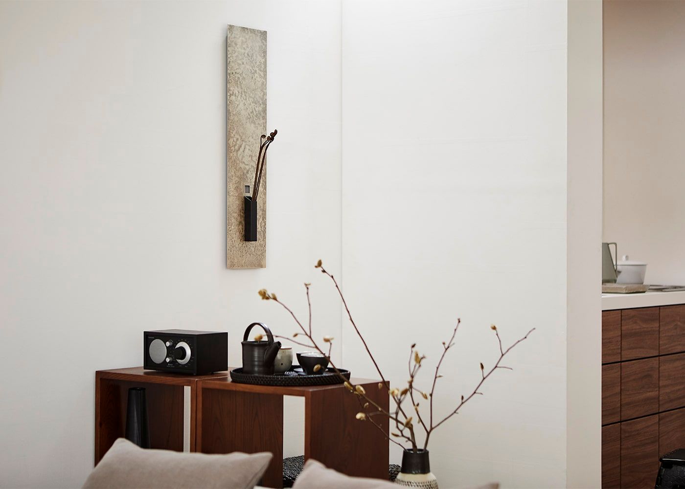 落ち着きのある和モダンな雰囲気で演出したコーディネート例。部屋の片隅に生まれる壁面スペースに、さりげないアクセントを加えることで、完成度の高いおしゃれな部屋作りが楽しめます。(写真は朧銀)