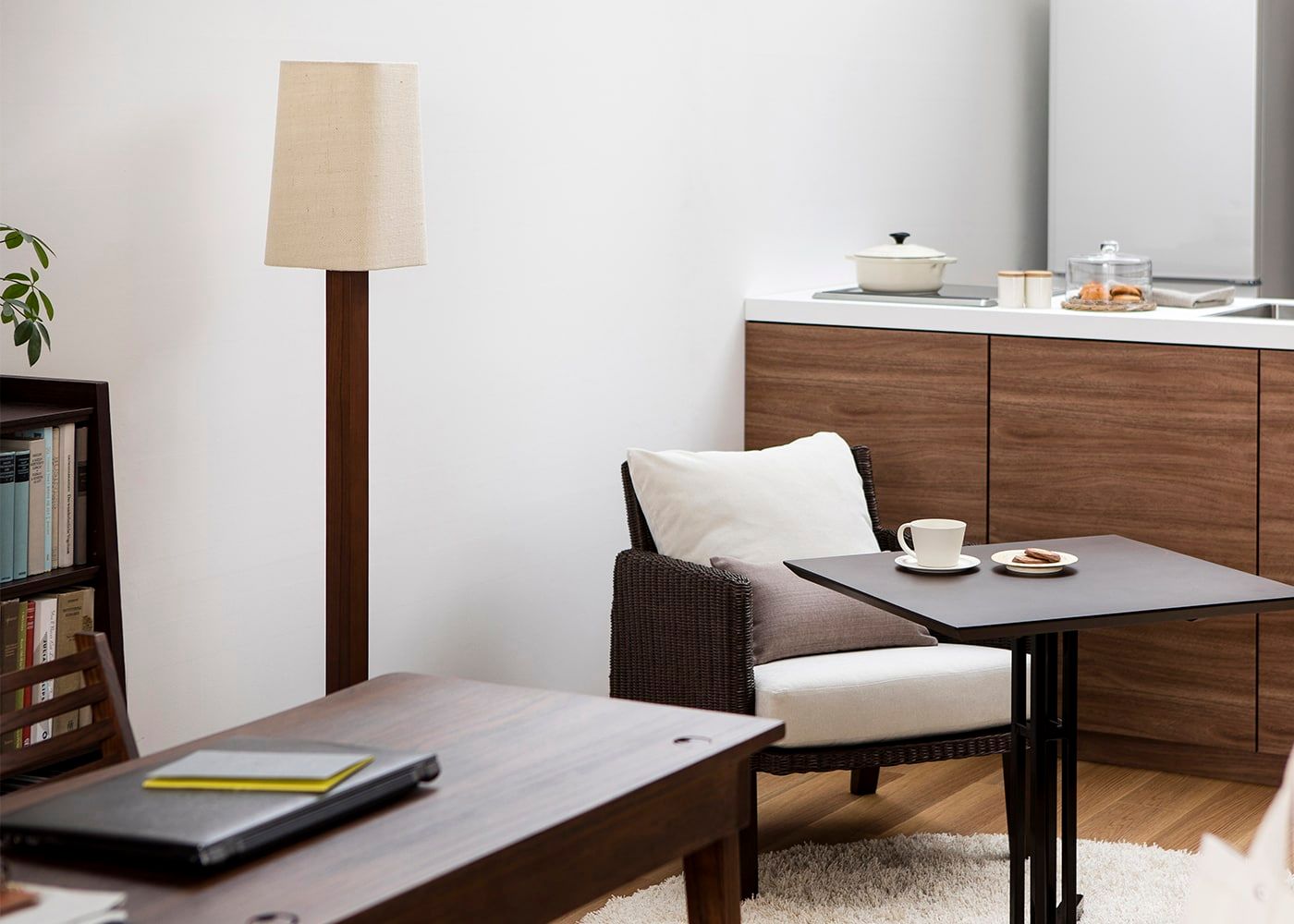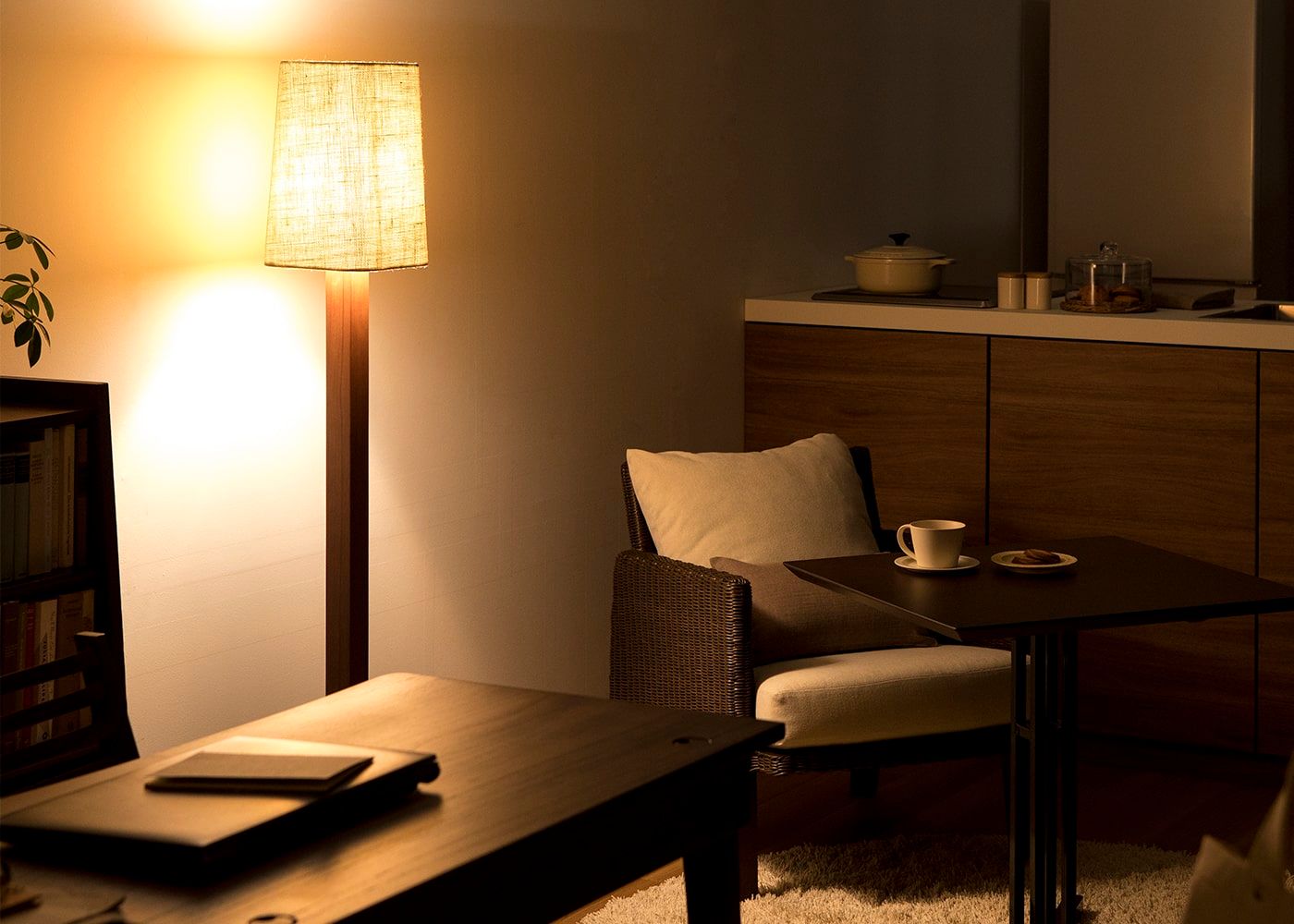 灯りのアクセントとして、一人暮らしのようなコンパクトな空間でも映えるジュート・フロアランプ。ラウンジスペースのようなスペースに雰囲気をつくり、日が落ちたあとの空間を盛り上げてくれます。