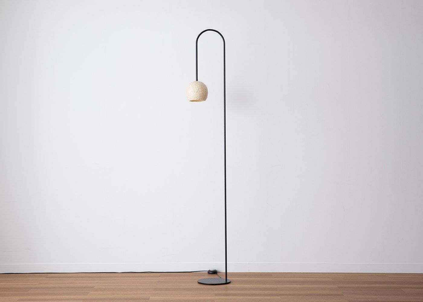 表情豊かな落水紙のシェードから漏れるぼんやりとした柔らかい灯りが、お部屋をやさしく照らします。光が宙に浮いているかのような不思議なフロアーランプです。(写真は電球ON)