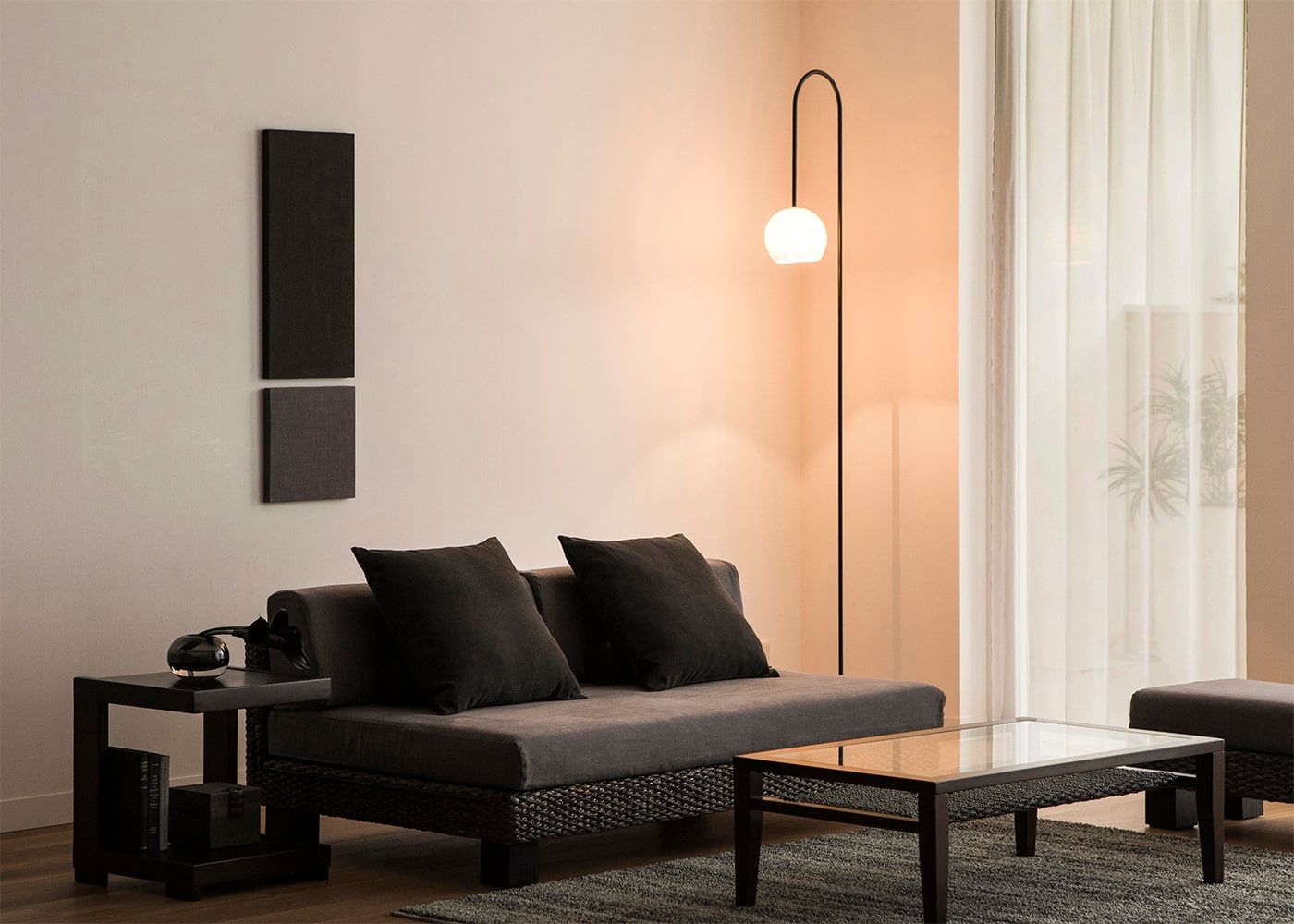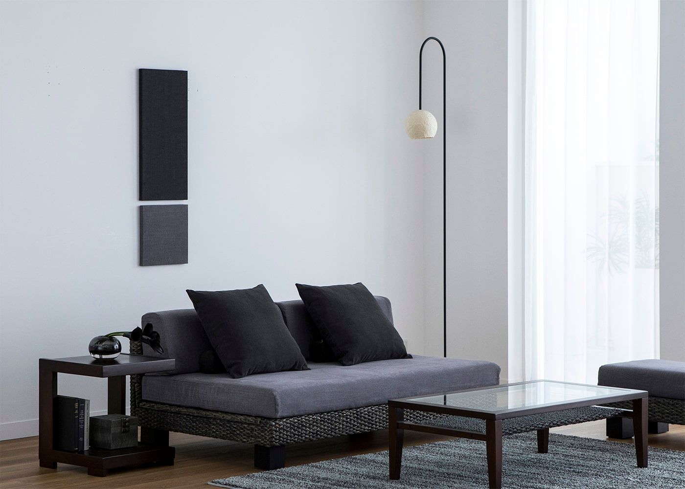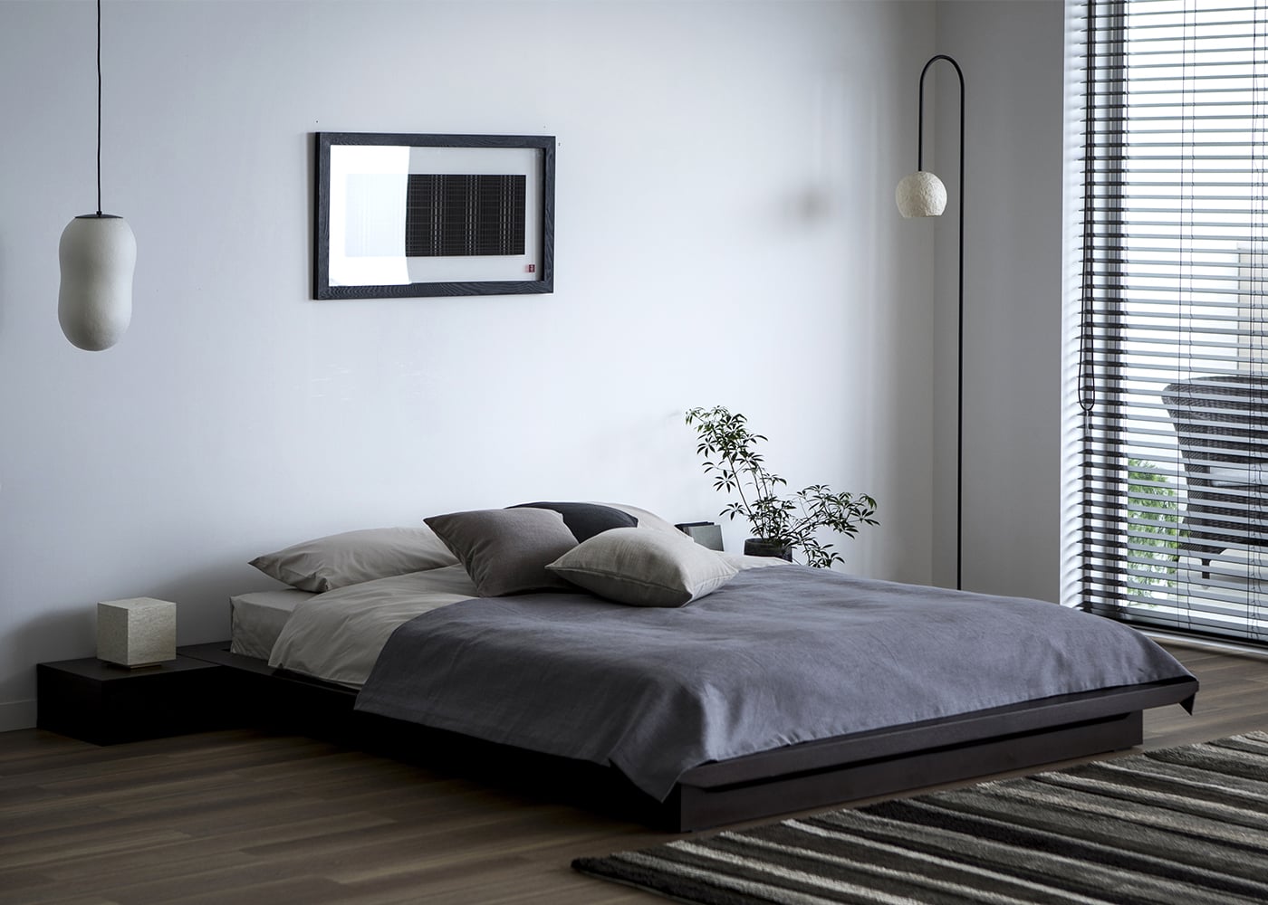 ローベッドとの高低差によって、オブジェのようなユニークな意匠がより際立ちます。弧を描く黒いフレームが、和モダンスタイルを演出するモノトーンな