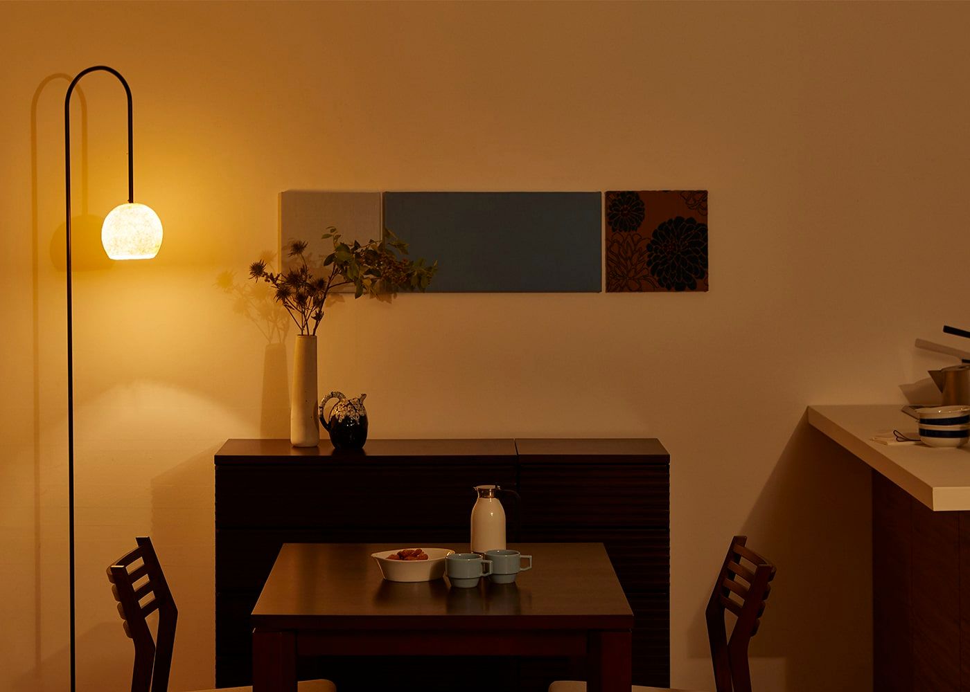 温かな雰囲気で食卓を灯してくれる、fuwari-fsi-1。線が細いフレームの垂れる先に、見るものを魅了する光が広がって、特別感のある非日常的なダイニング空間を演出してくれます。