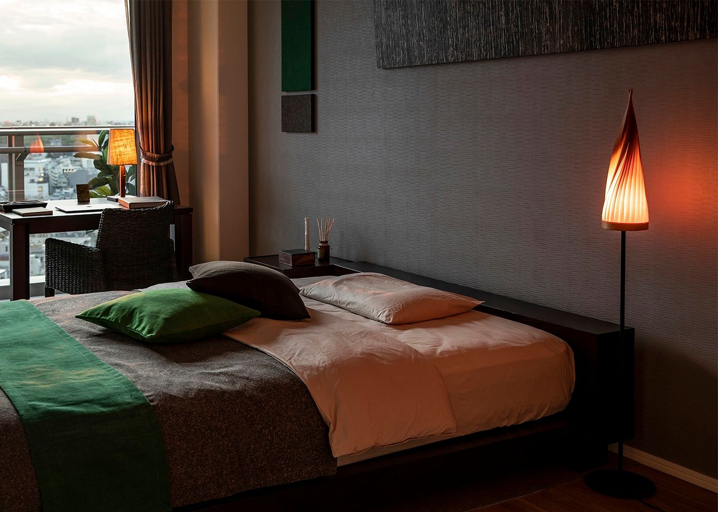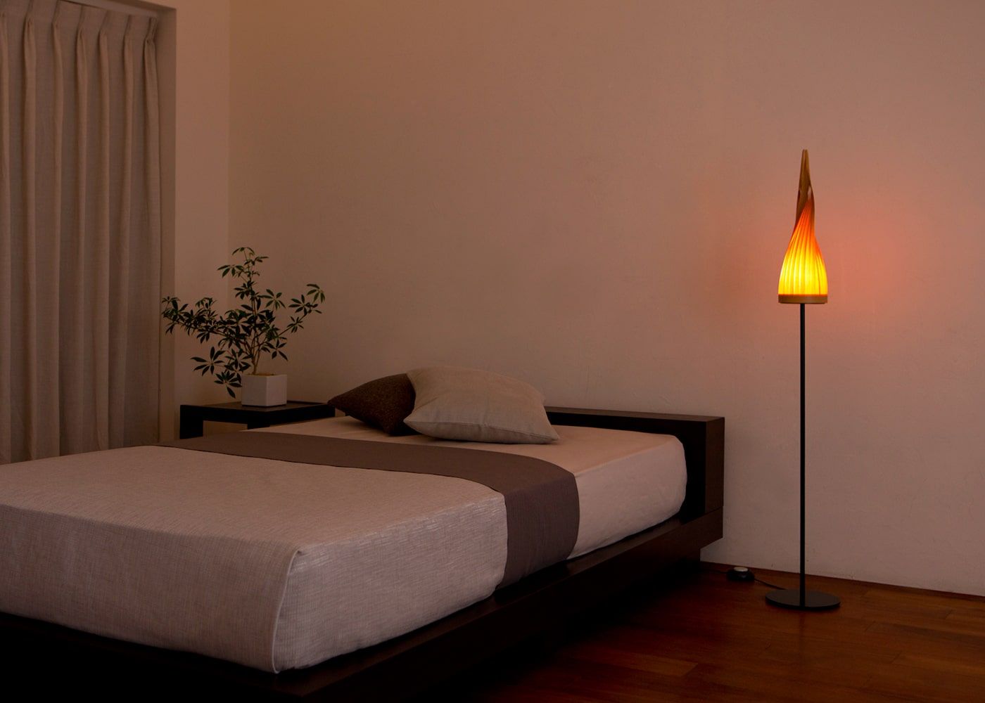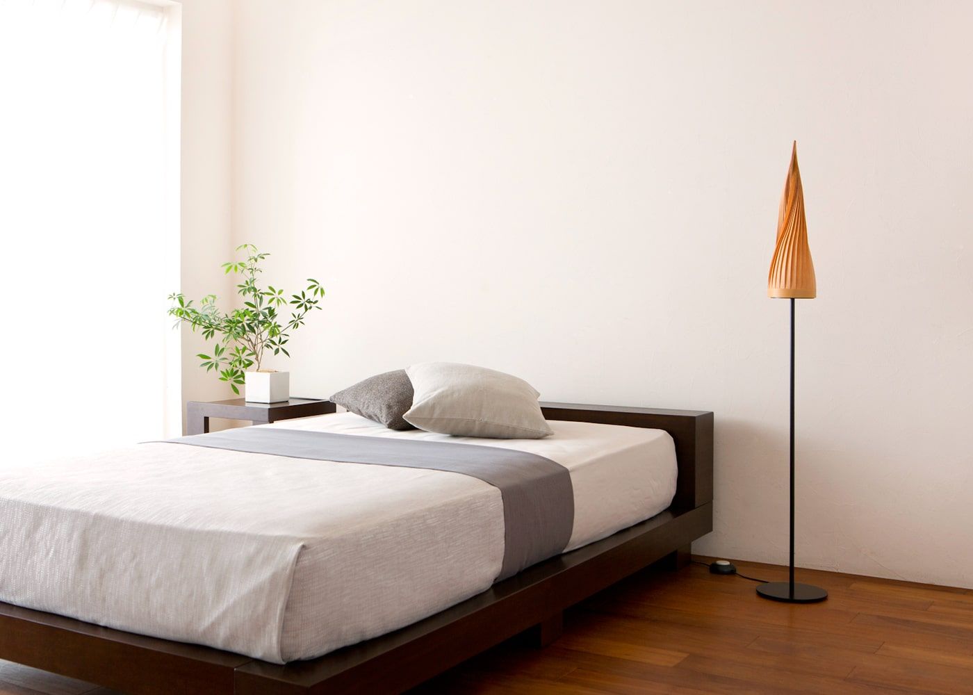 ローベッドの脇に「komorebi fsi-1」を配置することで、寝室全体が特別な空気感に包まれます。日常とは異なる時間を過ごしたい方におすすめの照明です。(写真は850タイプ)