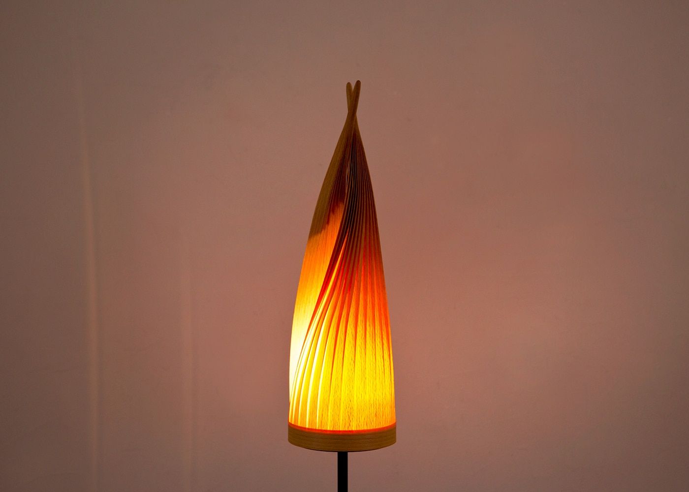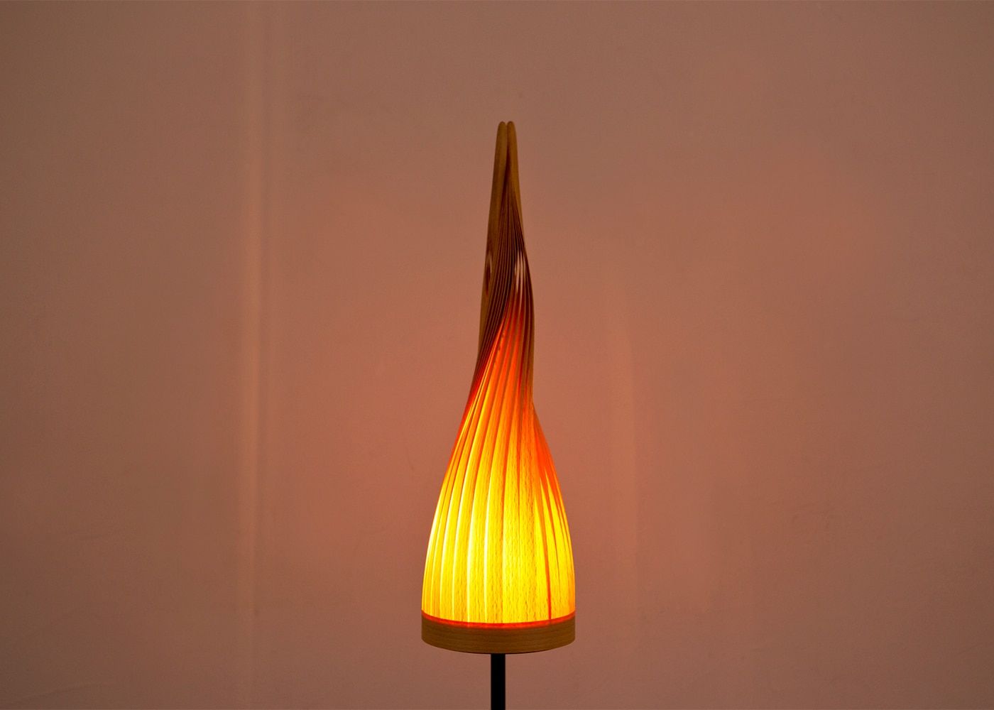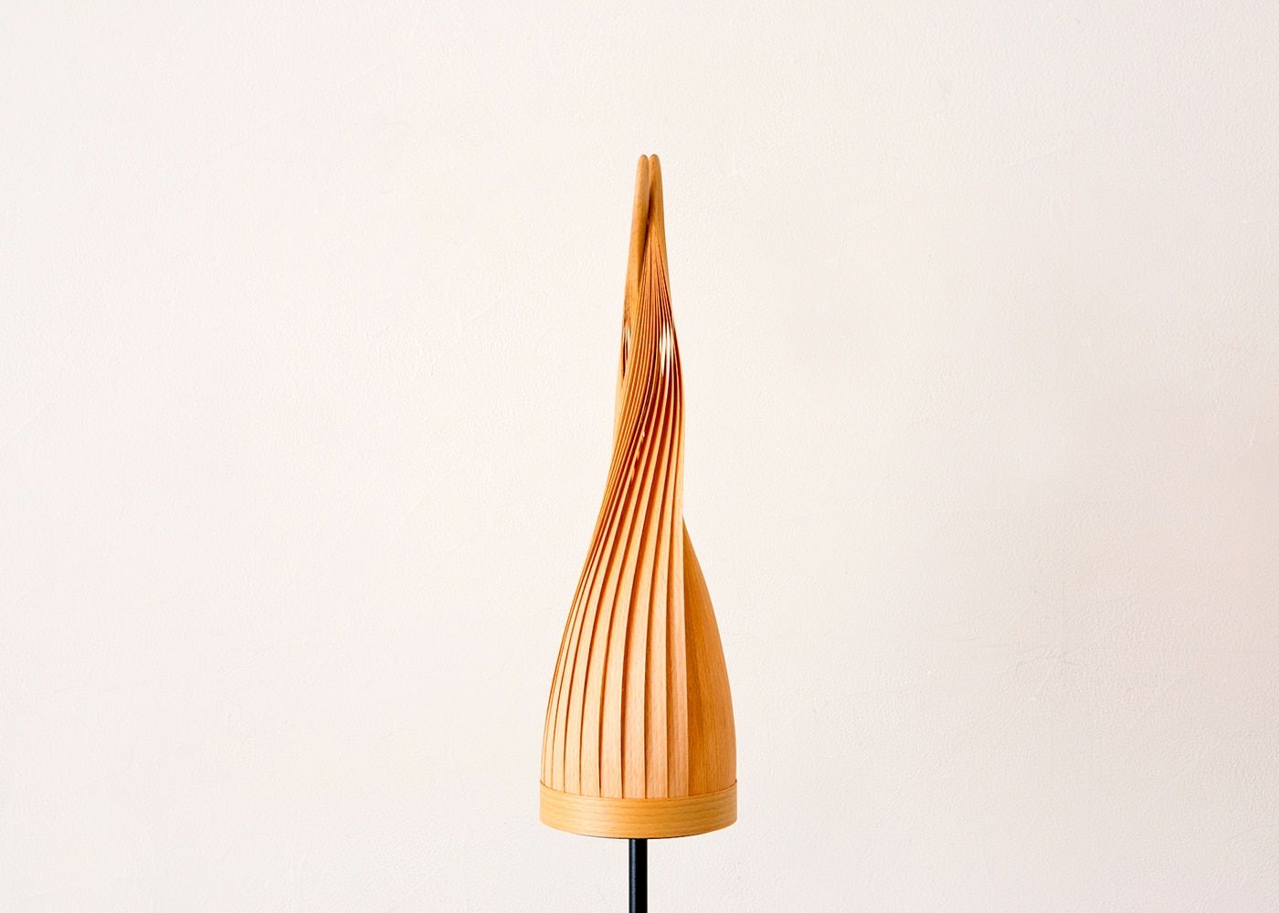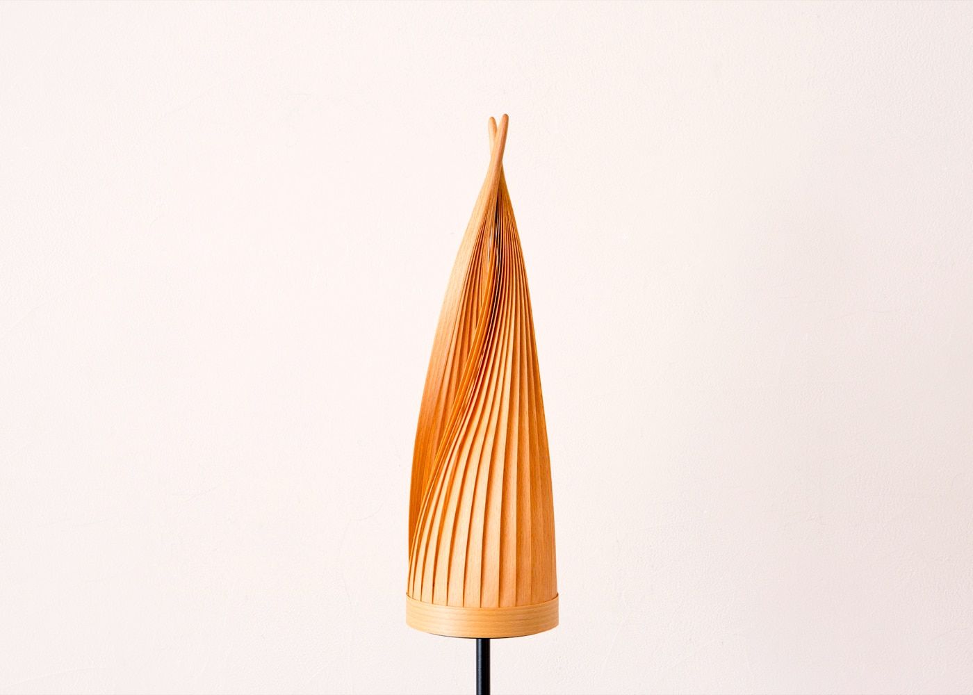 ブナ材シェードの重なりがデザインの魅力のひとつです。ねじるような形状のシェードは、灯りをつけなくても陰影を生み出し、立体的な表情を楽しめます。