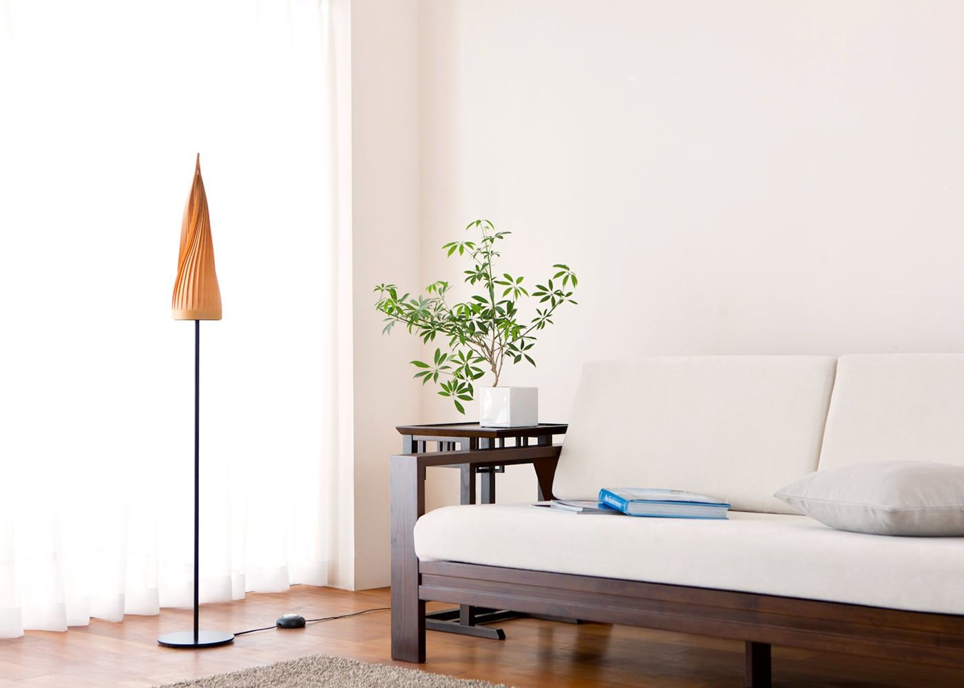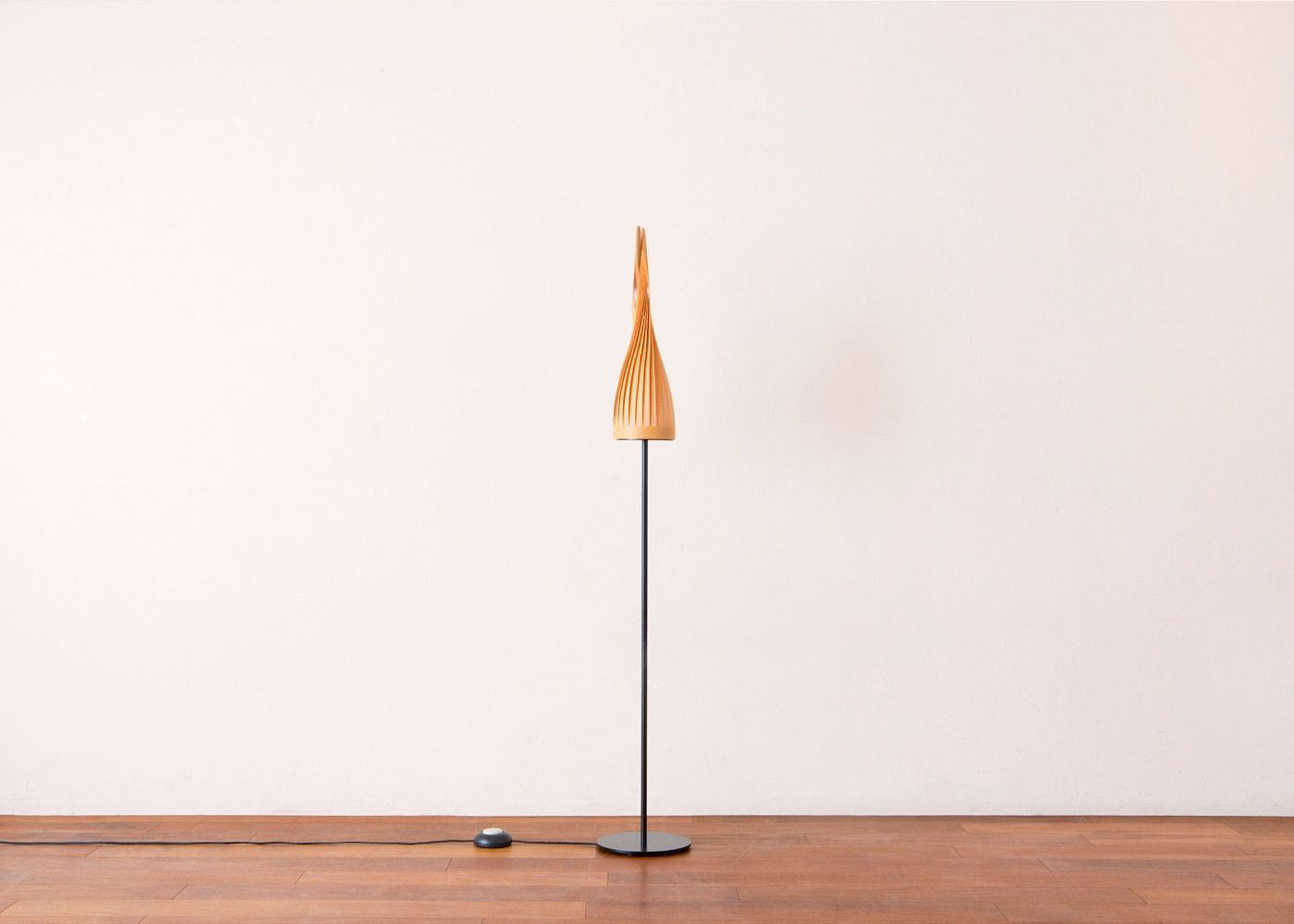 天然ブナ材のシェードがやさしい光を灯すフロアーランプkomorebi fsi-1。スライスしたブナを透過して放たれる光は温かく、木肌の隙間から覗くようにやさしく洩れてくる光はまるで木漏れ日のようです。