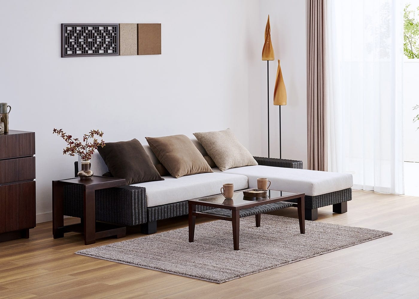 850と1300タイプを並べてコーディネートすることで、空間に高さのアクセントを付けることができます。ローソファの低さが際立つ、高低差のある部屋づくりも楽しめます。(写真は左から1300タイプと850タイプ)