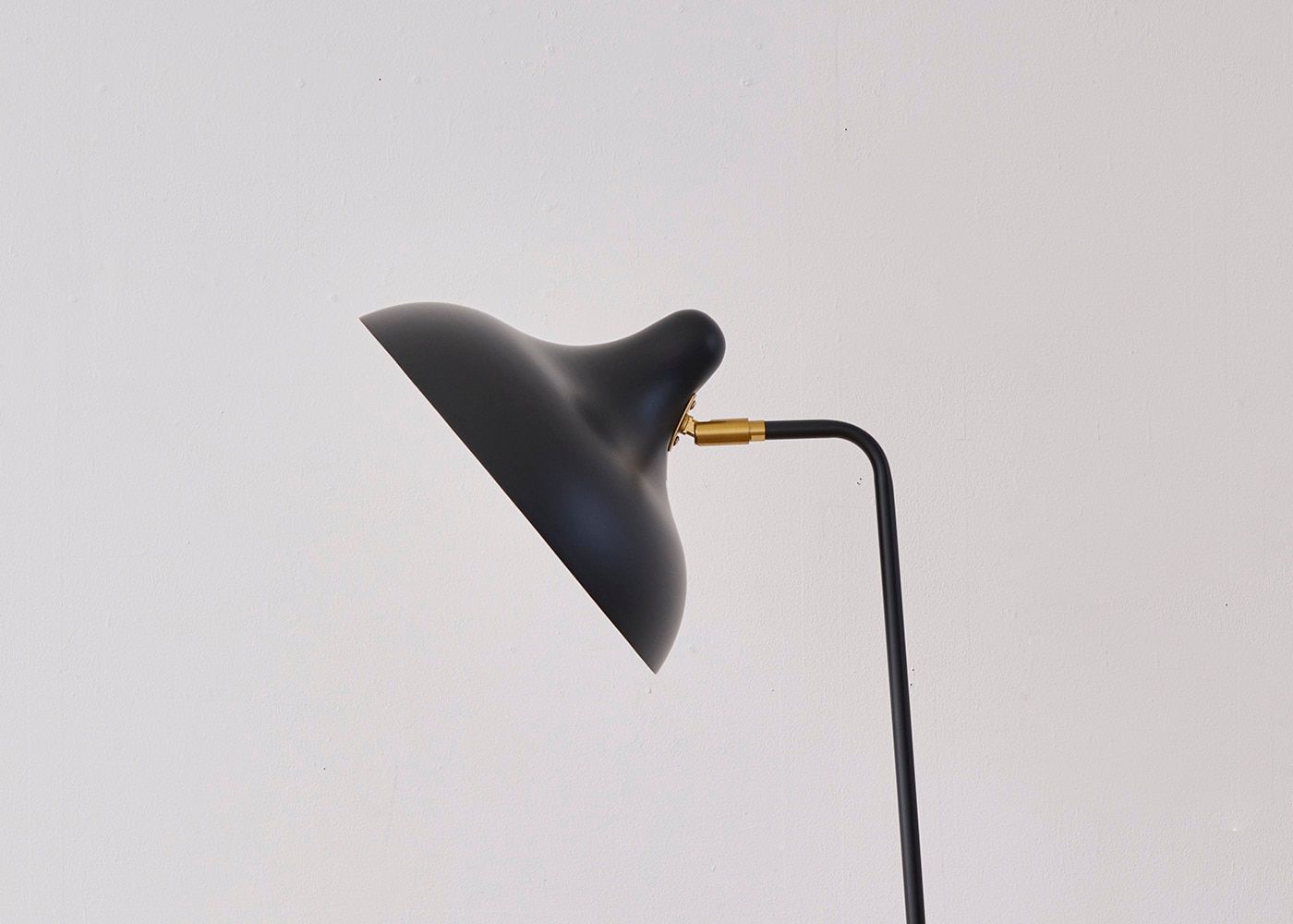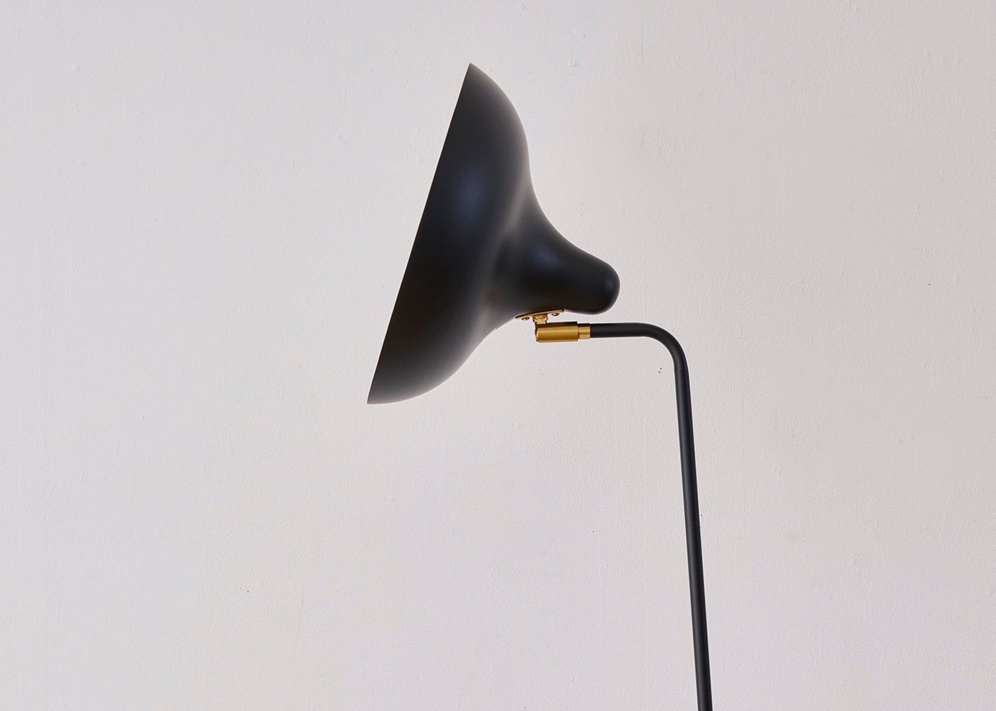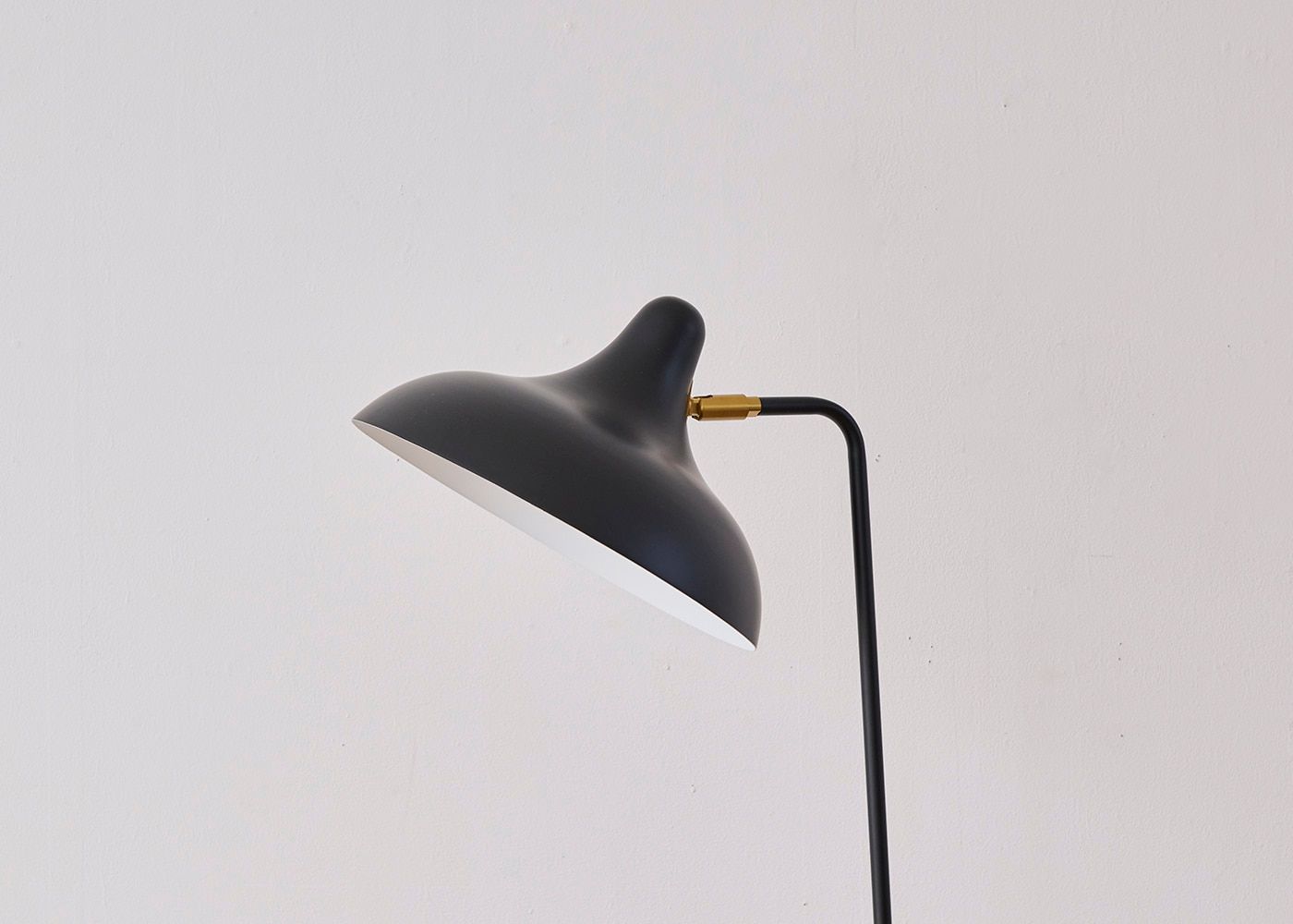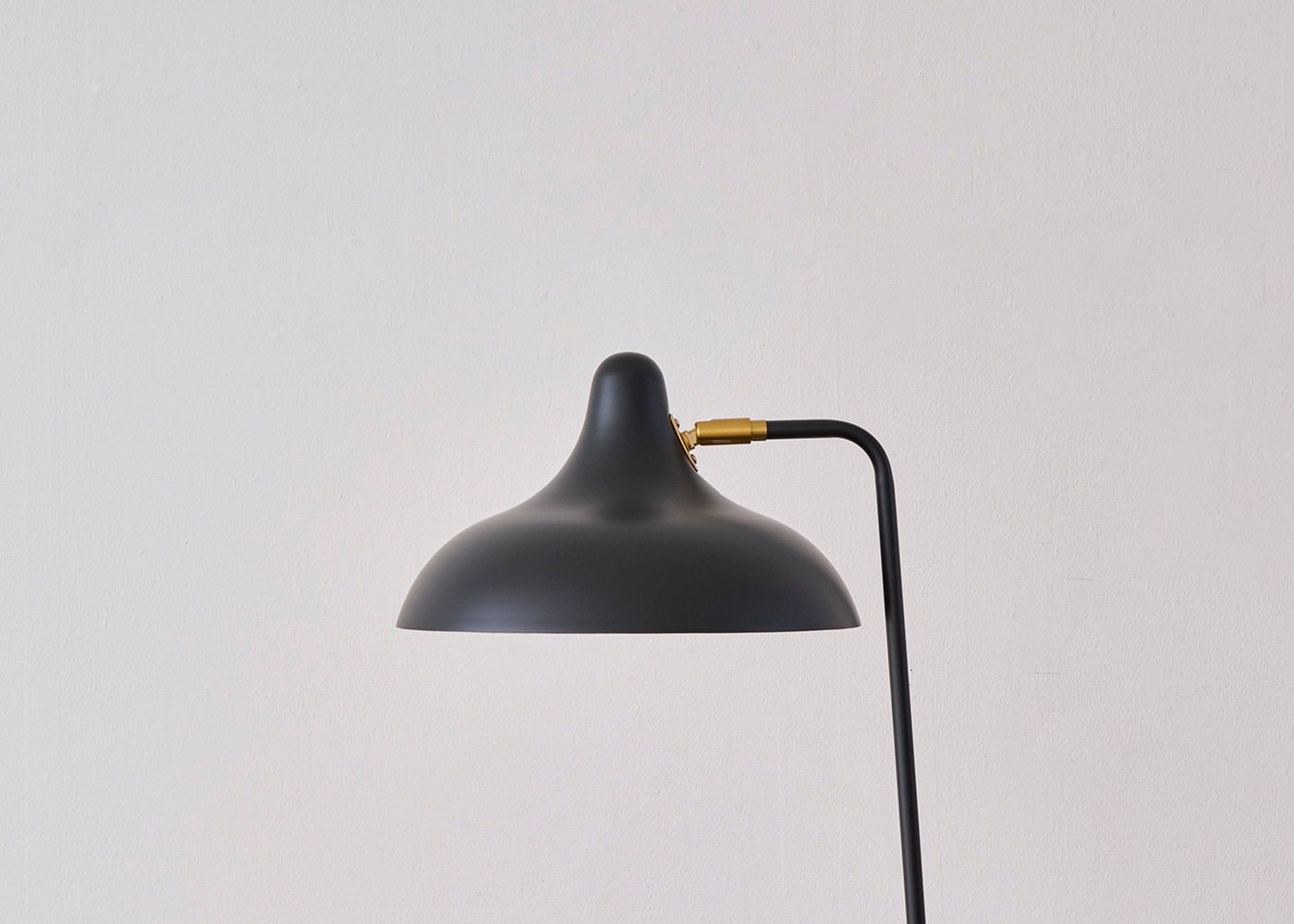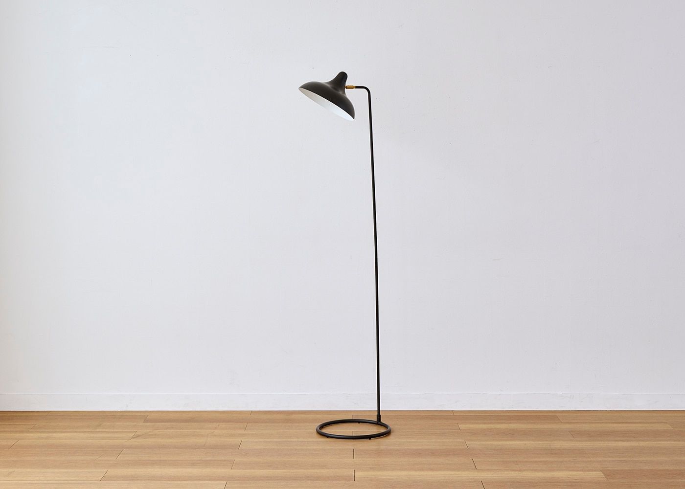 直線的な細い支柱に大きめのシェードを合わせた、ボーラー・フロアーランプ。モダンでミニマルな空間に溶け込みつつも、シンプルだからこそ引き立つ存在感が魅力的です。(写真は電球ON)
