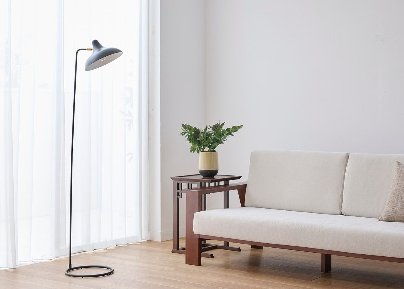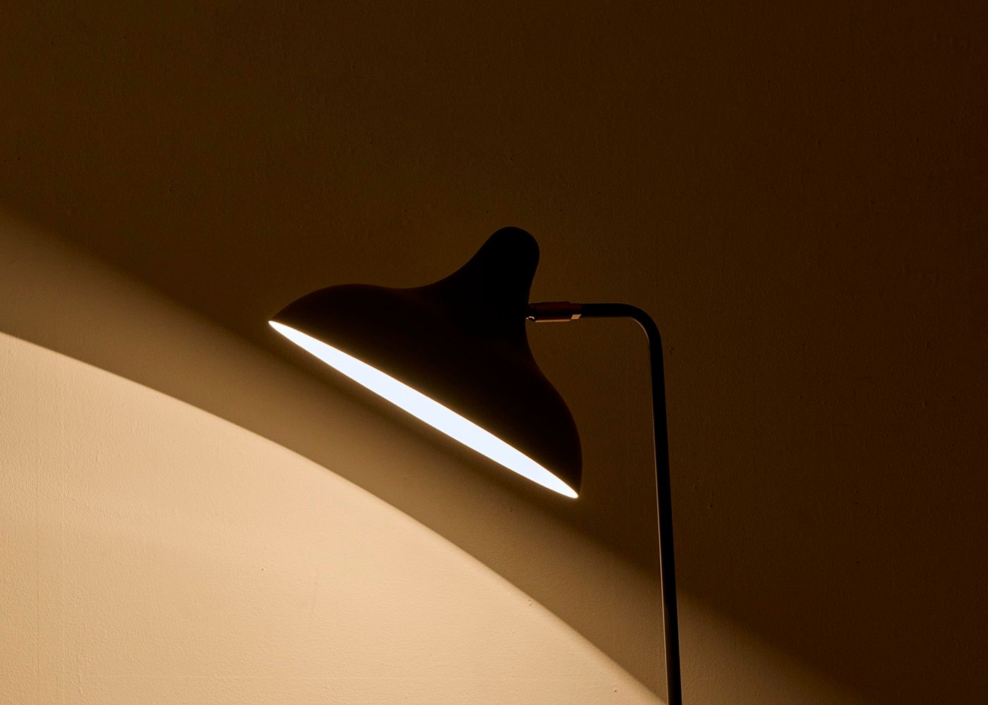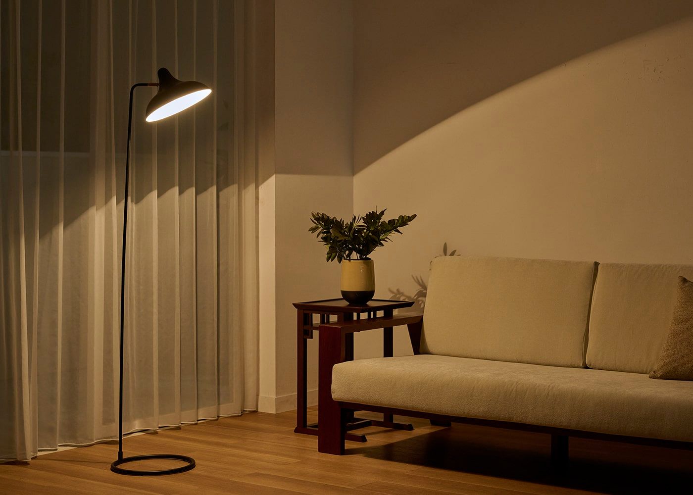 ボーラー・フロアランプは広範囲を明るく照らすことができ、光源の方向とその反対側では光の対比が大きくなります。照明を配置するだけで、異なる空間の雰囲気を作り出すことが可能です。(写真は電球ON)