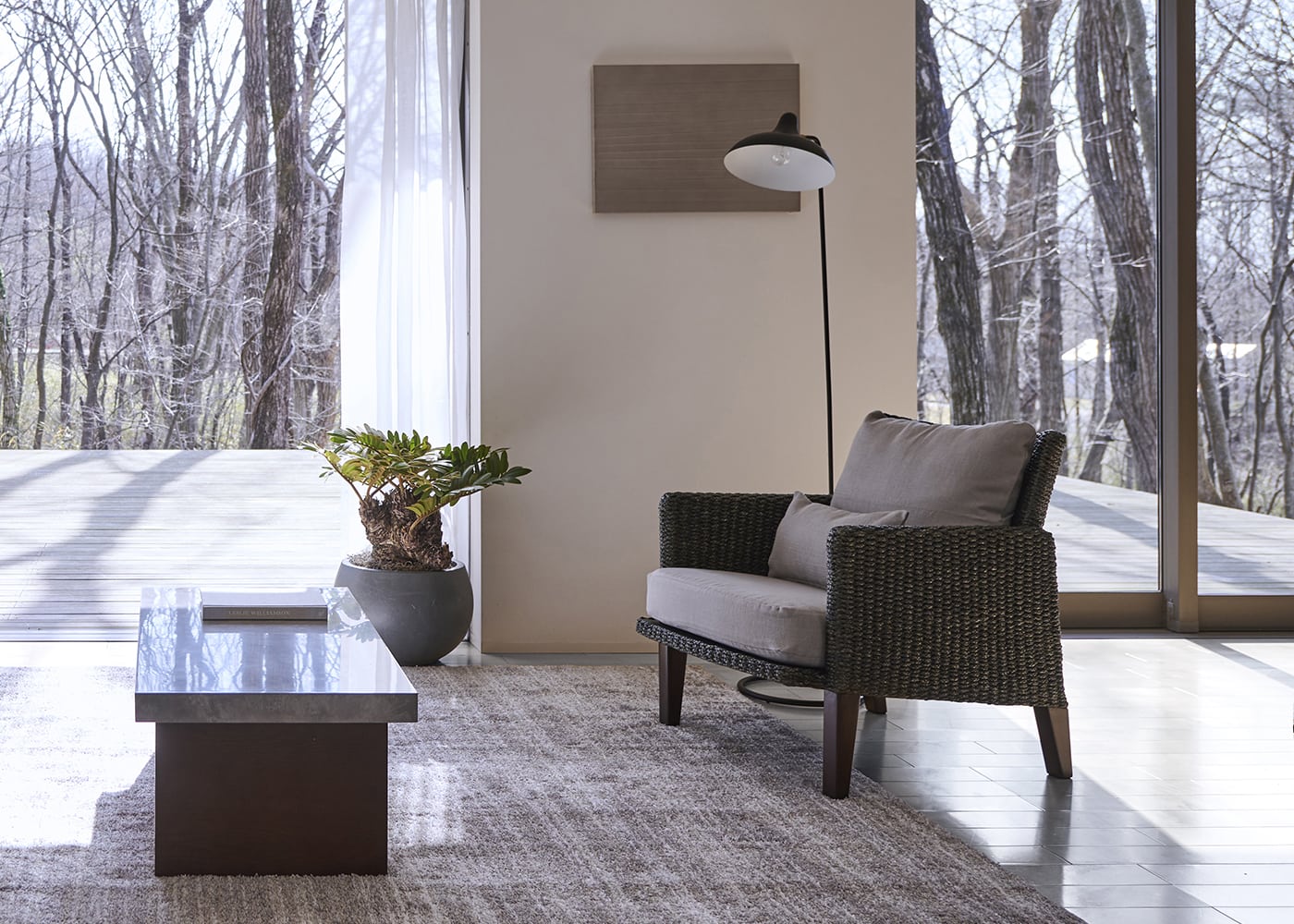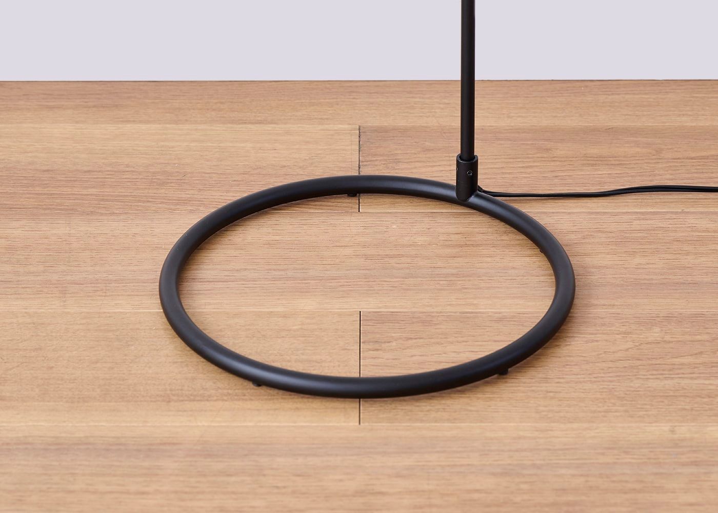 足元にはリング状の土台で抜け感を表現し、シャープな印象を加えました。モダンテイストを引き立てるとともに、お気に入りのラグやフローリングのデザインを際立たせる洗練されたデザインです。