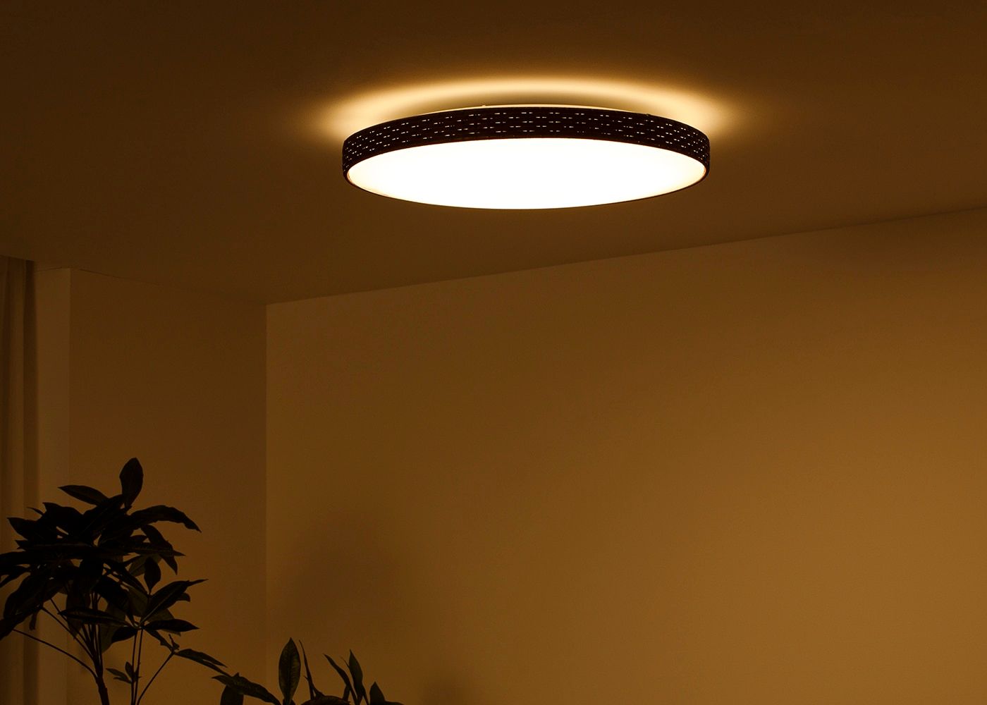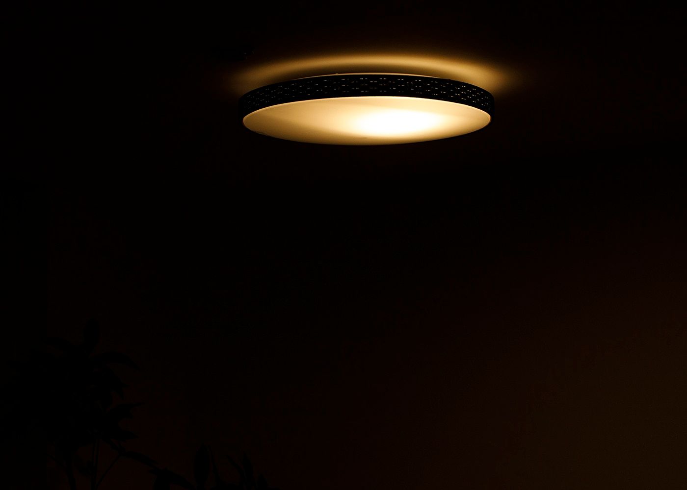 電球色は就寝前の使用にも適した光色で、心安らぐ落ち着いた雰囲気を演出します。(写真は12畳用 ダークブラウン。電球色 明るさ50%)